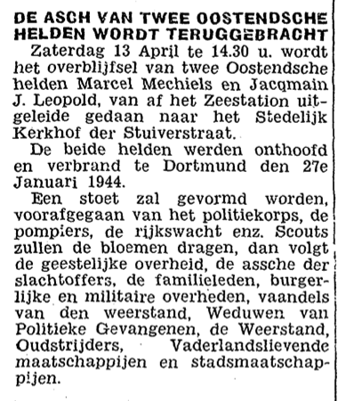 Trefwoorden MECHIELS MARCEL (MICKY) FRANCOIS (1921-1944) (VERZETSSTRIJDER) JACQUEMYN J. LEOPOLD (WEERSTANDER) VERZET ; TWEEDE WERELDOORLOG Plaatskenmerk O.D.P.-archieven. Bibliotheek Kris Lambert KBOD1946 12-04-1946 Bron De Kustbode Pagina's 3 Print