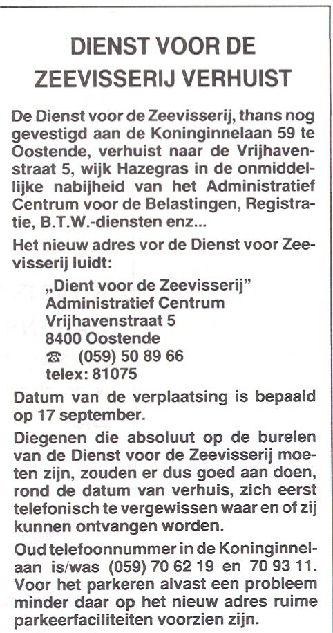 Trefwoorden DIENST VOOR DE ZEEVISSERIJ (VRIJHAVENSTRAAT) Plaatskenmerk VISS1984 14-09-1984 Auteurs Anoniem Bron Het Visserijblad Pagina's 11 Print