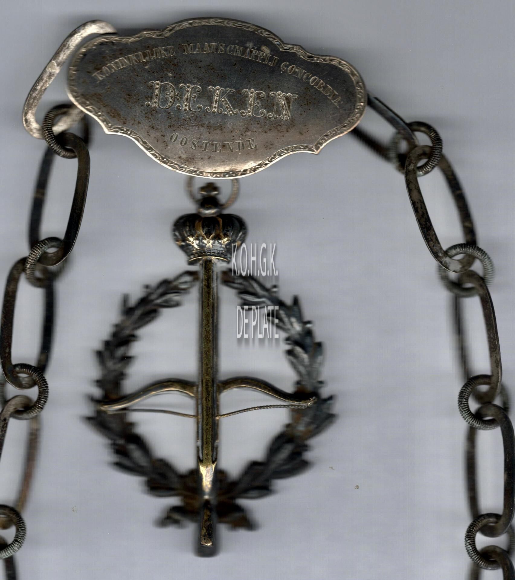 Op de voorzijde : rondom boven KONINKLIJKE MAATSCHAPPIJ CONCORDIA, centraal DEKEN, rondom onder OOSTENDE
