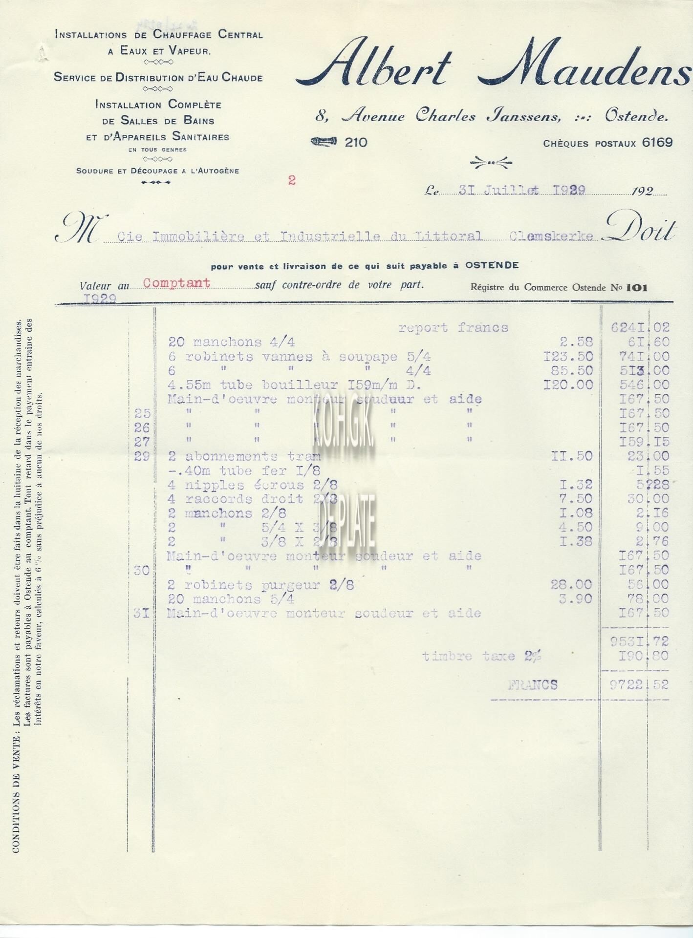 Installations de chauffage central à eaux et vapeur - Service de distribution d'eau chaude - Intallation complète de salles de bains et d'appareils sanitaires en tous genres - Soudure et découpage à l'autogène