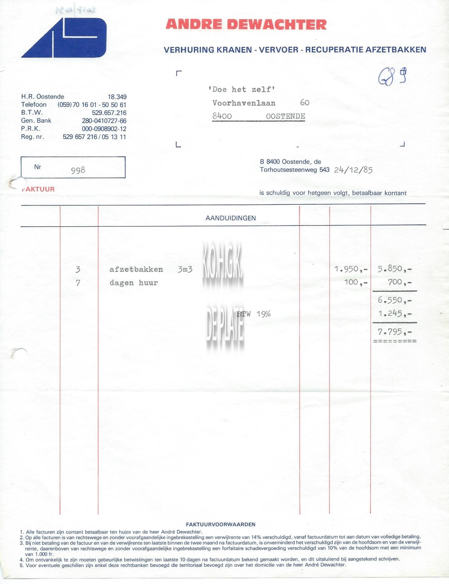 Factuur : André Dewachter. Verhuring afzetbakken, kranen, vervoer, recuperatie. Torhoutsesteenweg 543, Oostende