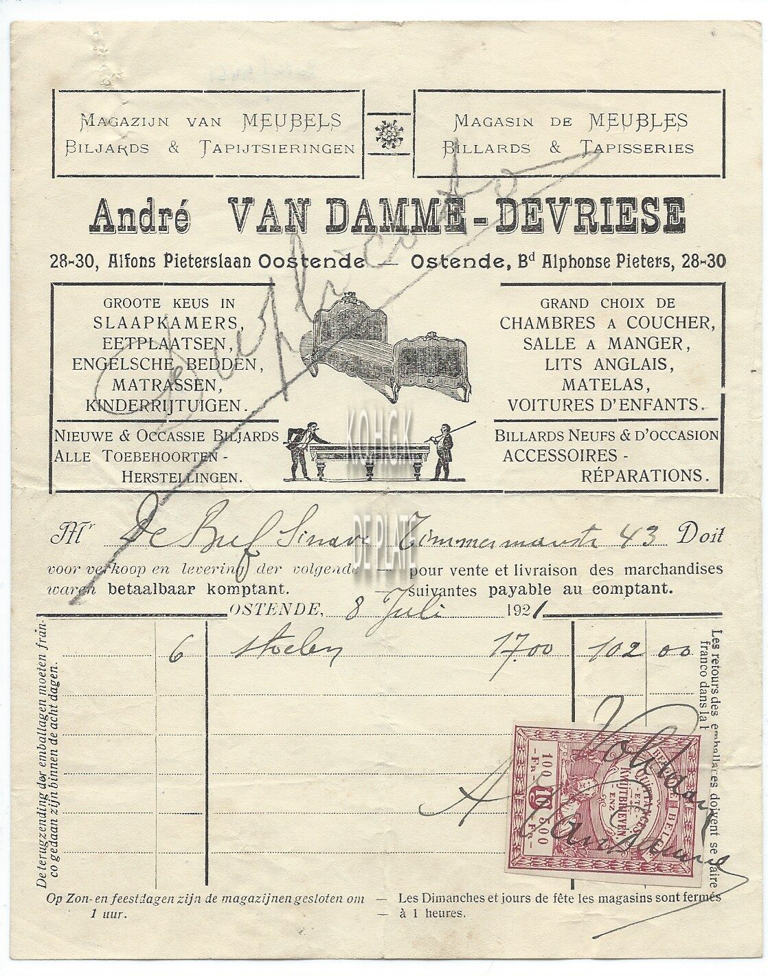 Trefwoorden HANDEL ; FACTUREN ANDRÉ VAN DAMME-DEVRIESE (MEUBELS BILJARTS MATRASSEN) ALFONS PIETERSLAAN Plaatskenmerk ARCHIEF 110 ARCHIEFDOOS HANDEL Inventarisnummers 2014/4461 08/ 07/ 1921 Herkomst HOSTYN NORBERT Print