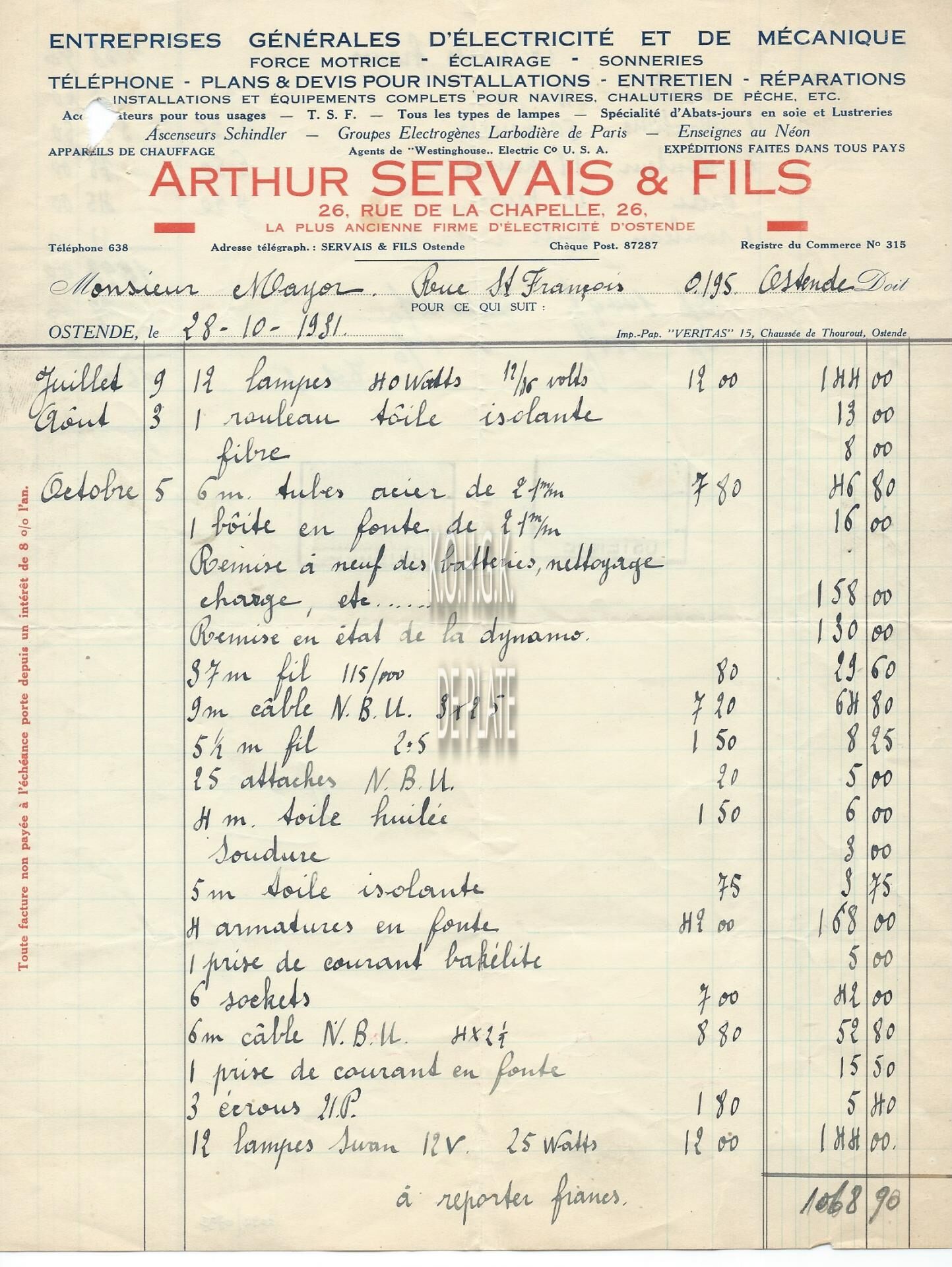 Trefwoorden HANDEL ; FACTUREN ARTHUR SERVAIS ET FILS (ELEKTRICITEIT) KAPELLESTRAAT Plaatskenmerk ARCHIEF 110 ARCHIEFDOOS HANDEL Inventarisnummers 2022/0397 28/ 10/ 1931 Herkomst AANKOOP Vervaardiger Imp.-Pap. Veritas Print