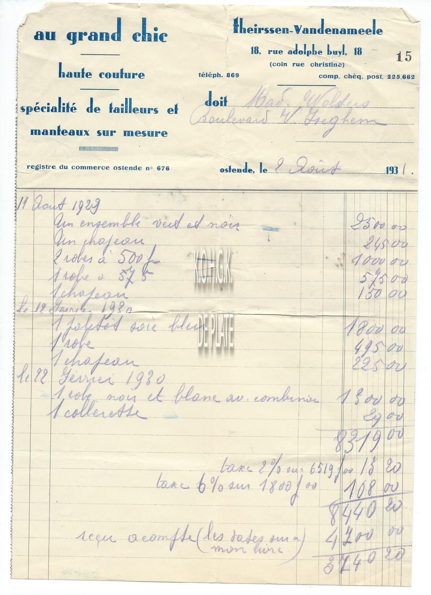 Factuur : Au Grand Chic. Haute Couture. Adolf Buylstraat 18, Oostende