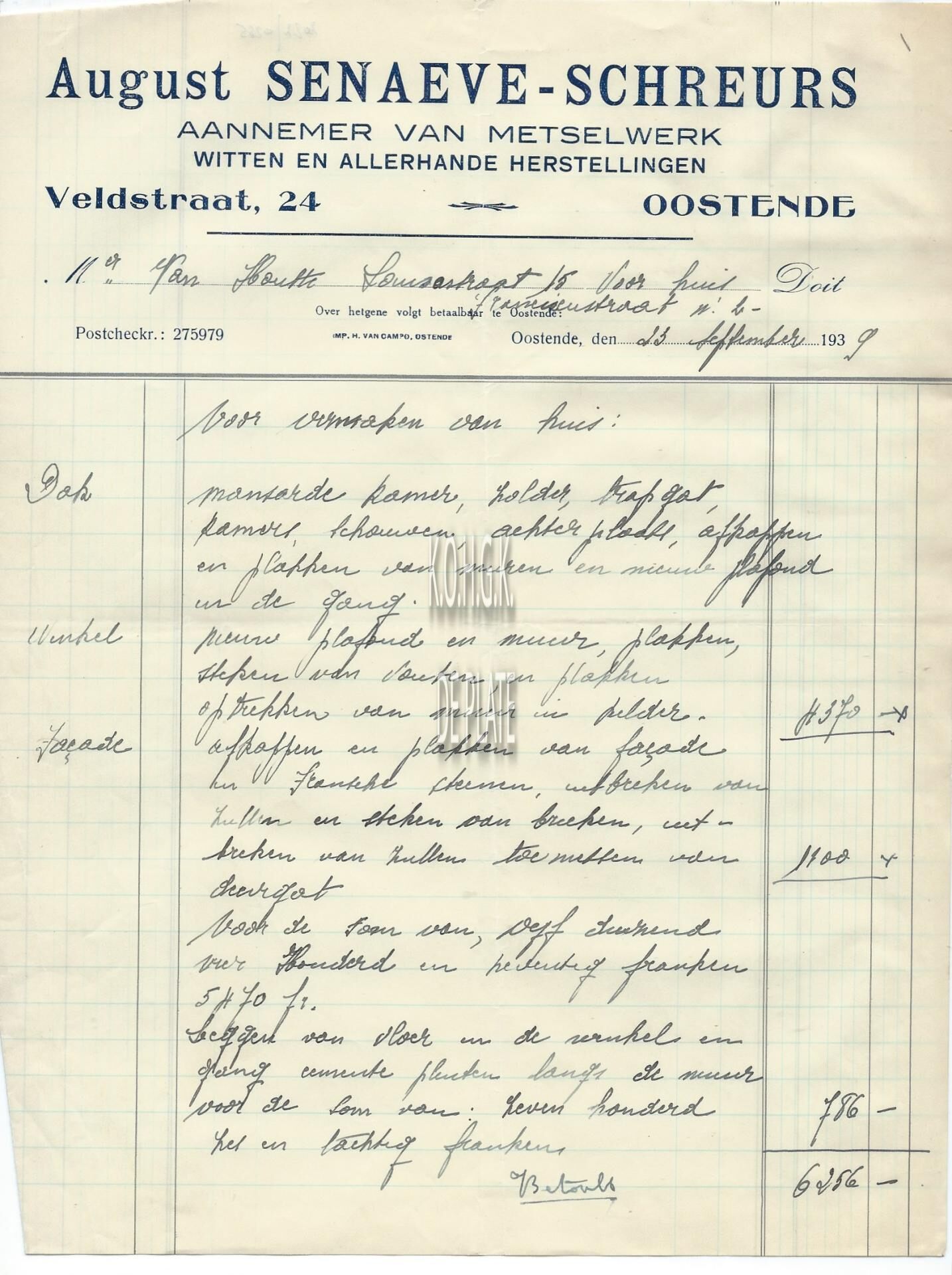 Trefwoorden HANDEL ; FACTUREN AUGUST SENAEVE-SCHREURS EN ZOON (AANNEMERS) NIJVERHEID ; AANNEMERS VELDSTRAAT Plaatskenmerk ARCHIEF 110 ARCHIEFDOOS HANDEL Inventarisnummers 2022/0265 23/ 09/ 1939 Herkomst AANKOOP Print
