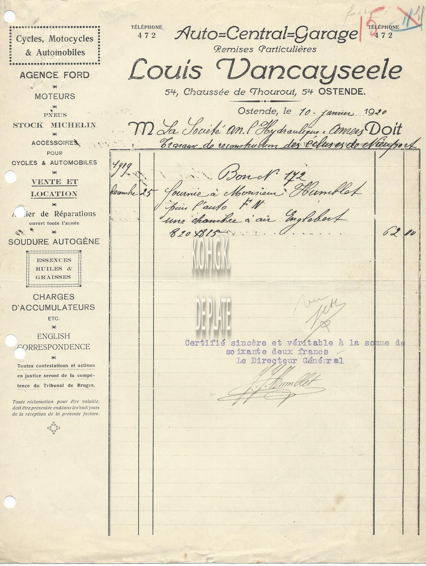 Omschrijving Agence Ford. - De garage werd in 1936 overgenomen door Ferdinand Stoops. Trefwoorden HANDEL ; FACTUREN AUTO CENTRAL GARAGE LOUIS VANCAYSEELE VERVOER ; GARAGES TORHOUTSESTEENWEG Plaatskenmerk ARCHIEF 110 ARCHIEFDOOS HANDEL Inventarisnummers 2022/0199 10/ 01/ 1920 Herkomst AANKOOP Print