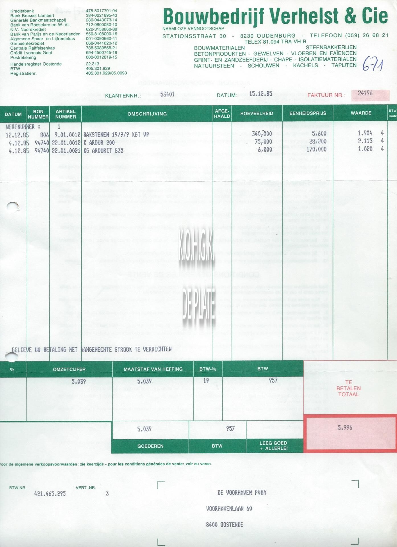 Factuur : Bouwbedrijf Verhelst & Cie. Stationsstraat 30, Oudenburg
