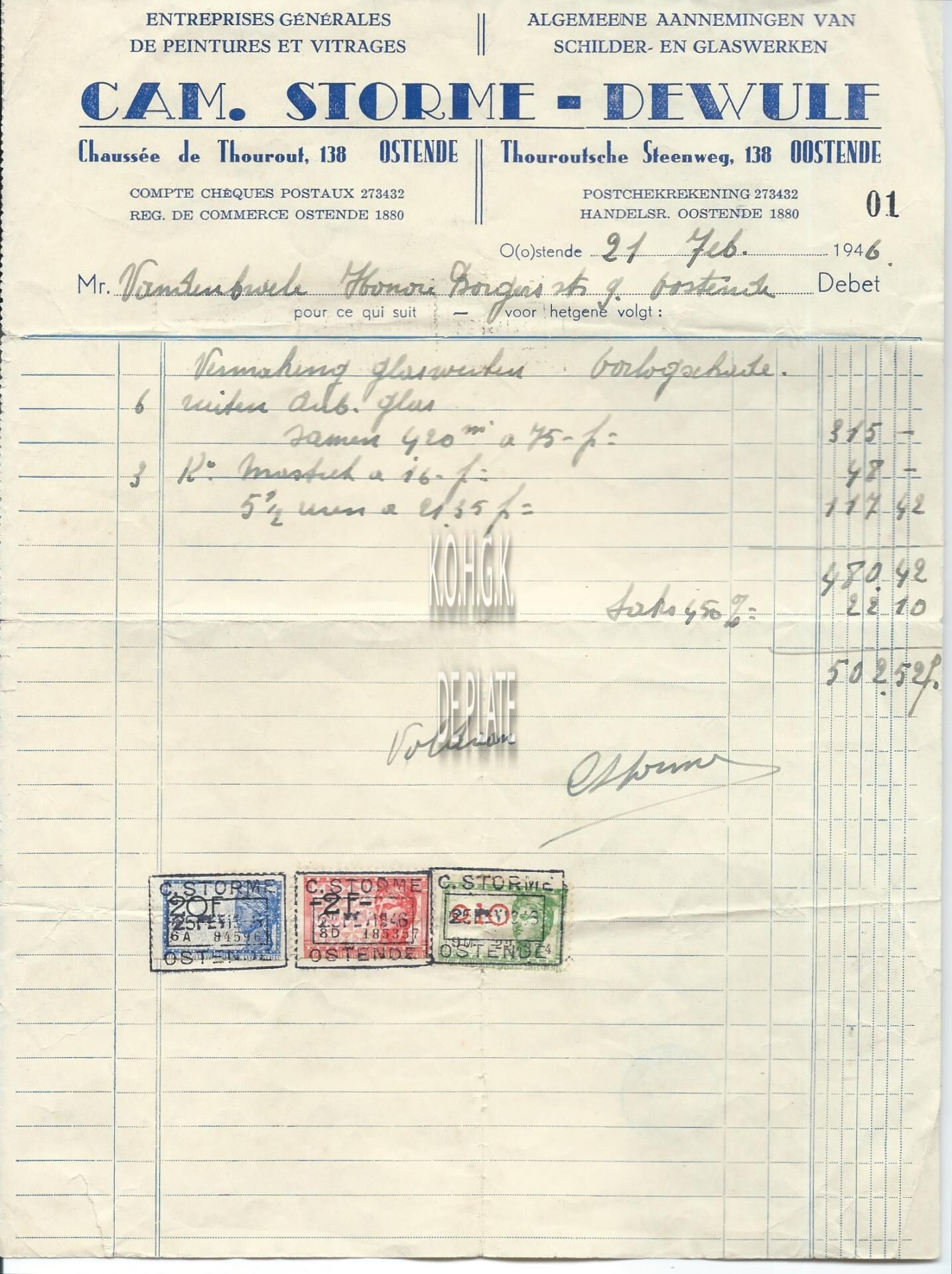 Factuur : Cam. Storme-Dewulf. Schilderwerken - Glaswerk. Torhoutsesteenweg 138, Oostende