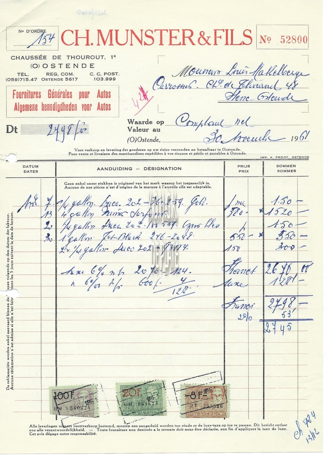 Factuur : Ch. Munster et Fils. Auto onderdelen. Torhoutsesteenweg 1b, Oostende