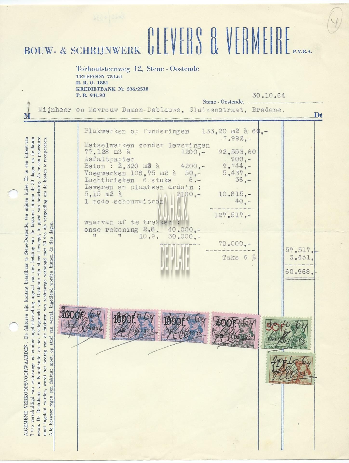 Trefwoorden HANDEL ; FACTUREN CLEVERS EN VERMEIRE (BOUW- EN SCHRIJNWERK) TORHOUTSESTEENWEG Plaatskenmerk ARCHIEF 110 ARCHIEFDOOS HANDEL Inventarisnummers 2022/0336 30/ 10/ 1964 Herkomst AANKOOP Print