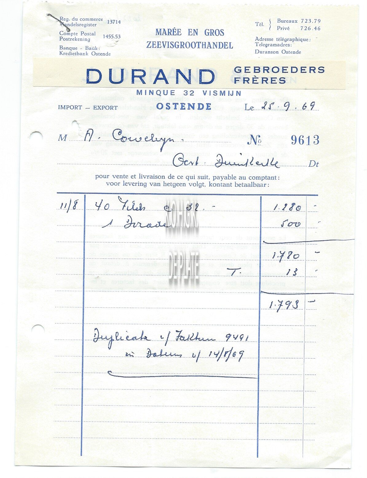 Factuur : Durand Gebroeders. Zeevisgroothandel. Vismijn 32, Oostende
