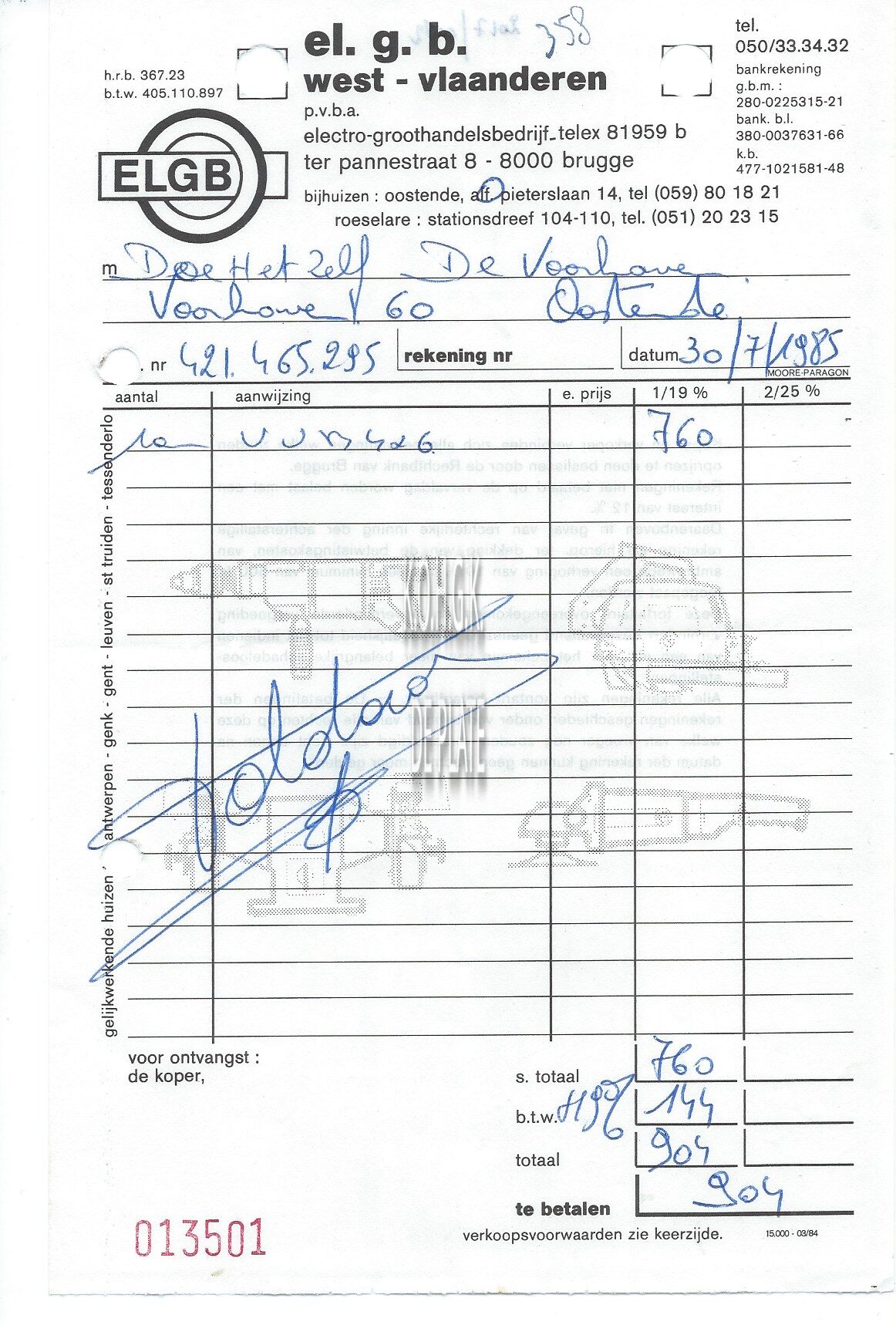 Omschrijving Hoofdvestiging : Ter Pannestraat 8, Brugge Trefwoorden HANDEL ; FACTUREN ELGB (EL.G.B.) (ELEKTROHANDEL) ALFONS PIETERSLAAN Plaatskenmerk ARCHIEF 110 ARCHIEFDOOS HANDEL Inventarisnummers 2017/0082 30/ 07/ 1985 Print