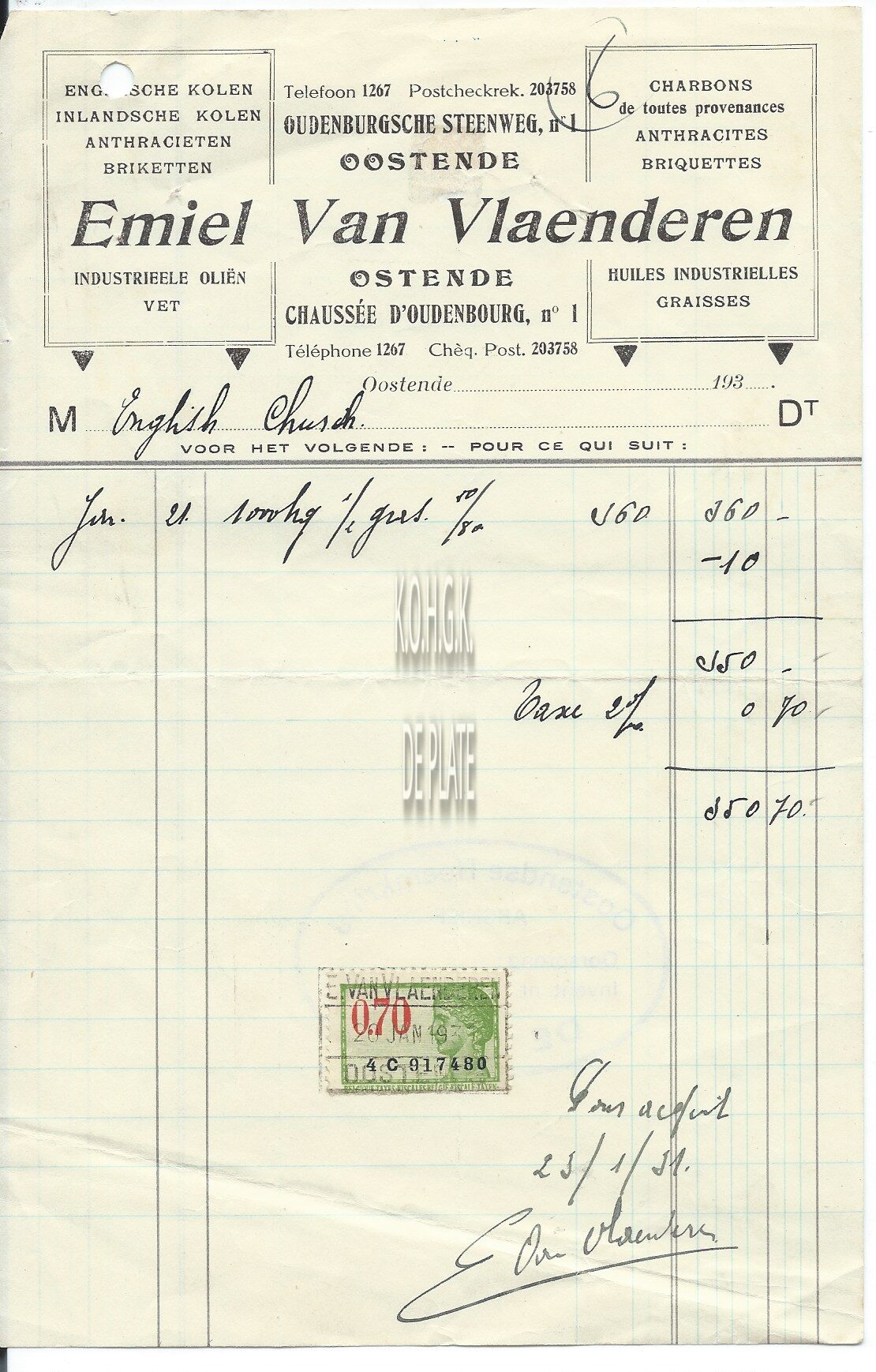 Omschrijving Het leveren van kolen aan de Anglicaanse kerk Trefwoorden HANDEL ; FACTUREN VAN VLAENDEREN EMIEL (KOLENHANDEL) HANDEL ; KOLEN EN ANDERE BRANDSTOFFEN OUDENBURGSESTEENWEG Plaatskenmerk ARCHIEF 110 ARCHIEFDOOS HANDEL Inventarisnummers 1963/0848 20/ 01/ 1931 Print