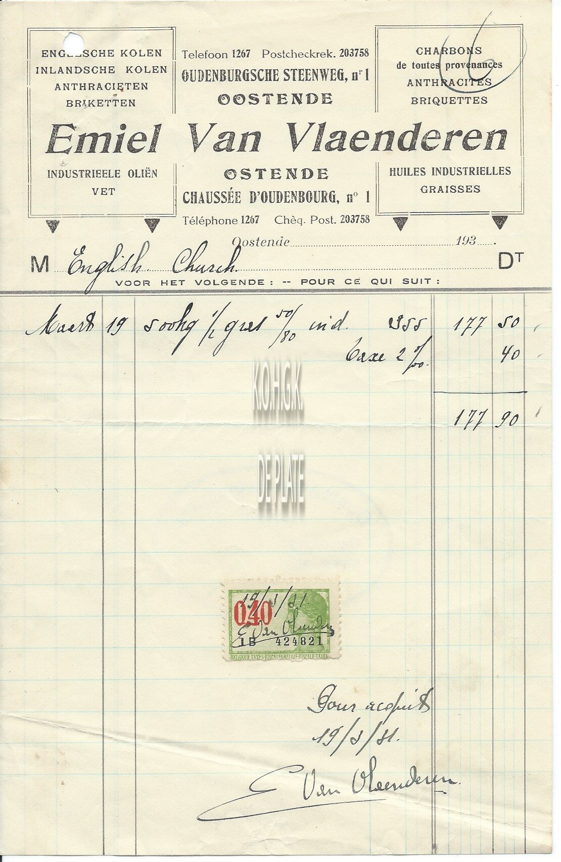 Omschrijving Het leveren van kolen aan de Anglicaanse kerk Trefwoorden HANDEL ; FACTUREN VAN VLAENDEREN EMIEL (KOLENHANDEL) HANDEL ; KOLEN EN ANDERE BRANDSTOFFEN OUDENBURGSESTEENWEG Plaatskenmerk ARCHIEF 110 ARCHIEFDOOS HANDEL Inventarisnummers 2022/2316 19/ 03/ 1931 Print