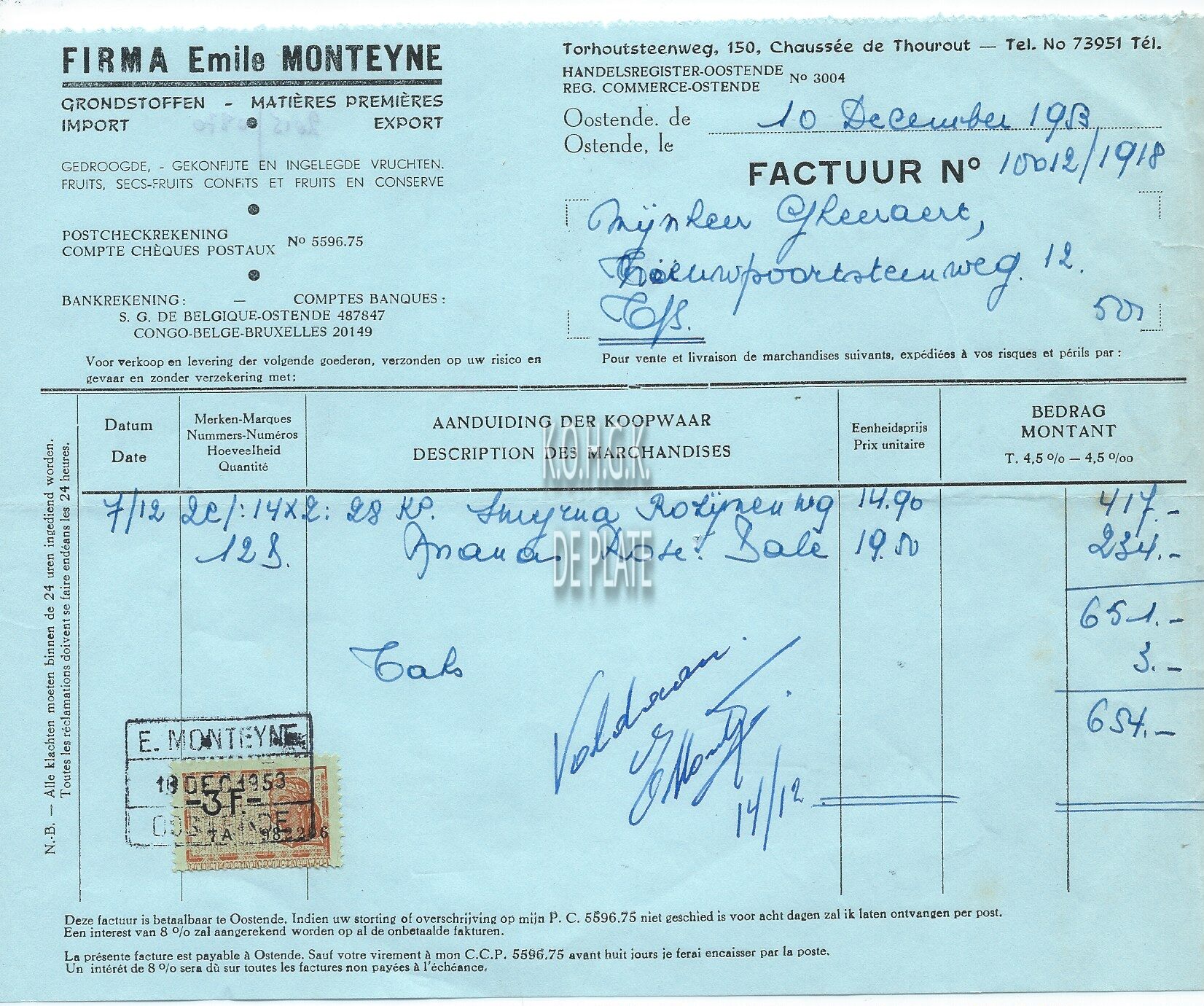 Trefwoorden HANDEL ; FACTUREN EMILE MONTEYNE (HANDEL IN GEDROOGDE EN GEKONFIJTE VRUCHTEN) TORHOUTSESTEENWEG Plaatskenmerk ARCHIEF 110 ARCHIEFDOOS HANDEL Inventarisnummers 2015/0870 10/ 12/ 1953 Print