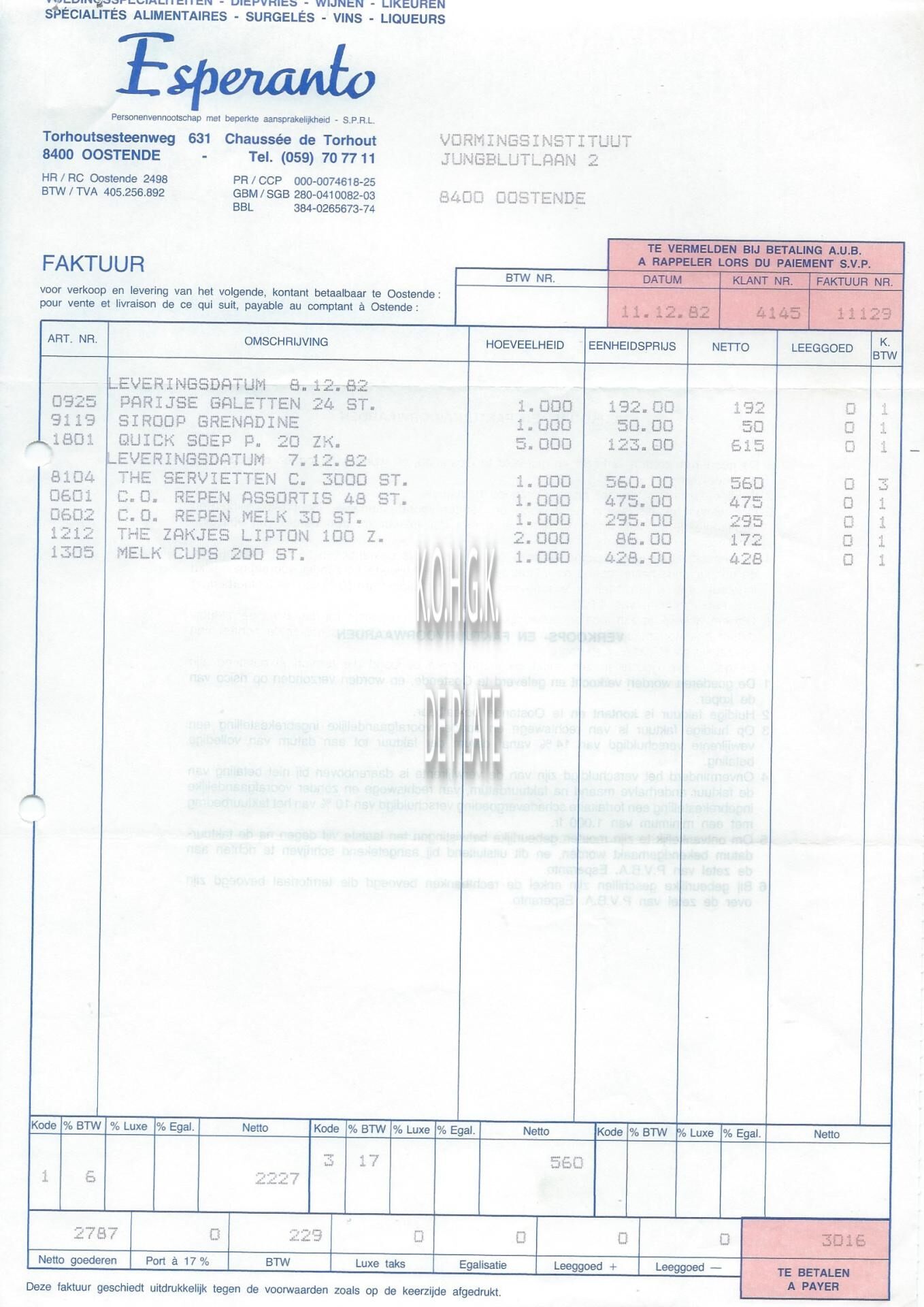 Factuur : Esperanto. Voeding. Torhoutsesteenweg 631, OOSTENDE