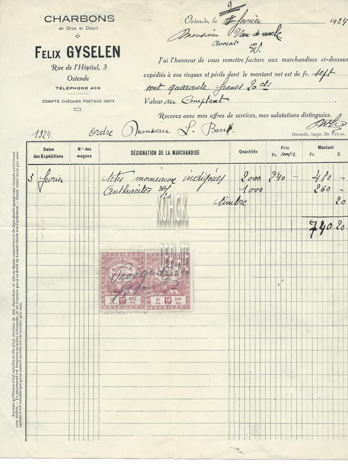 Trefwoorden HANDEL ; FACTUREN FELIX GYSELEN (KOLENHANDEL) HANDEL ; KOLEN EN ANDERE BRANDSTOFFEN HOSPITAALSTRAAT Plaatskenmerk ARCHIEF 110 ARCHIEFDOOS HANDEL Inventarisnummers 2022/0259 03/ 02/ 1924 Herkomst AANKOOP Vervaardiger Imprimerie Isidore De Vriese Print