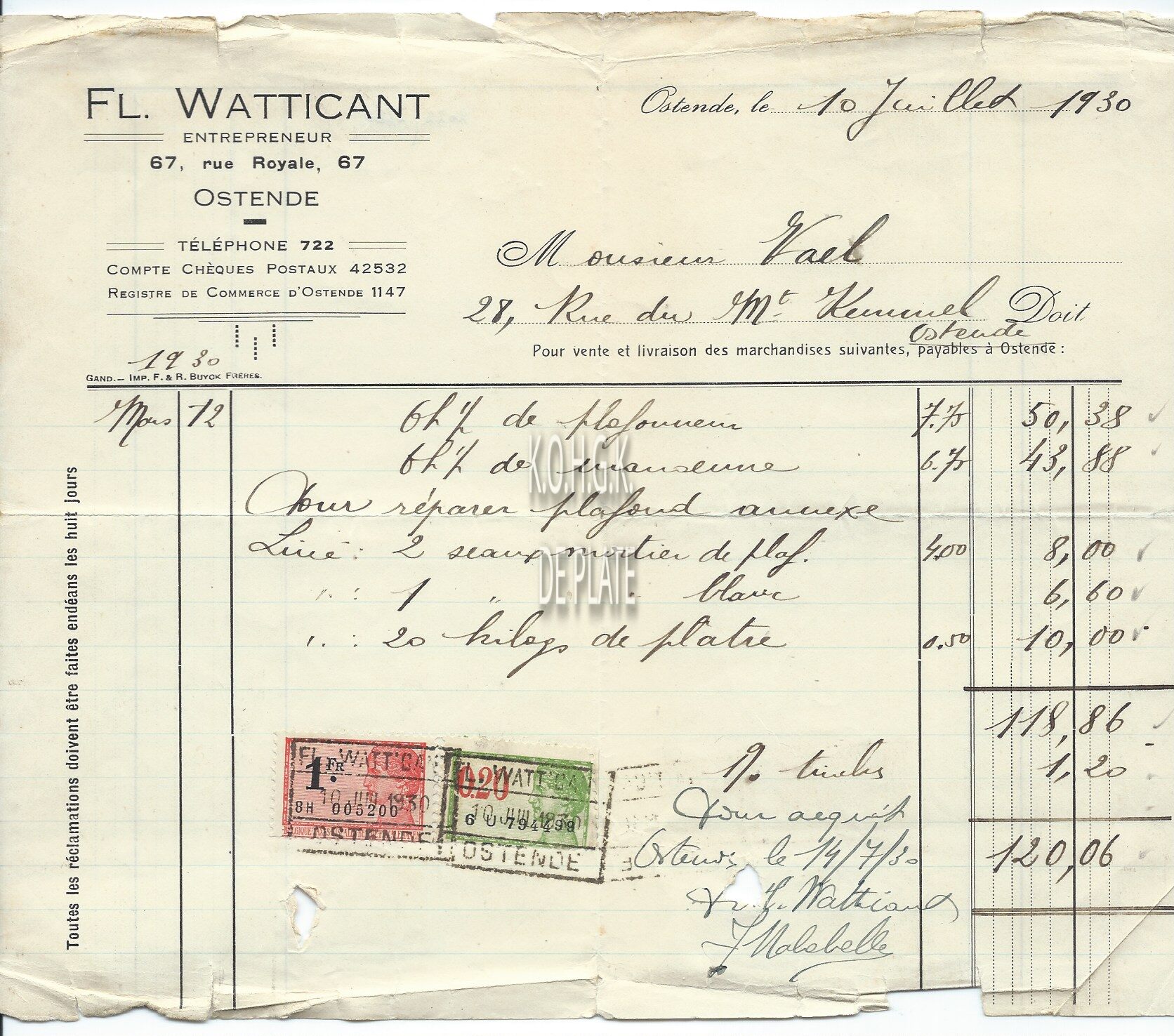 Factuur : Fl. Watticant. Aannemer. Koningsstraat 67, Oostende