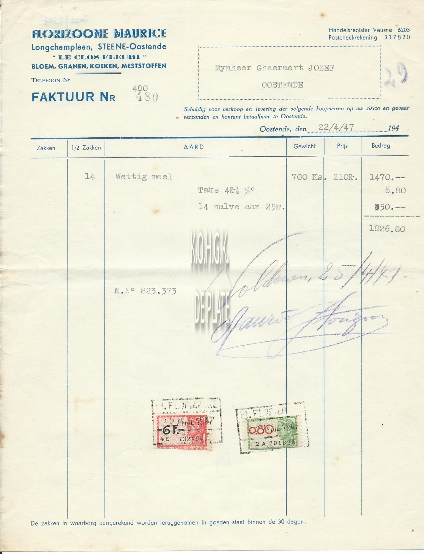 Trefwoorden HANDEL ; FACTUREN FLORIZOONE MAURICE (BLOEM GRANEN MESTSTOFFEN) LONGCHAMPLAAN Plaatskenmerk ARCHIEF 110 ARCHIEFDOOS HANDEL Inventarisnummers 2022/2387 22/ 04/ 1947 Print