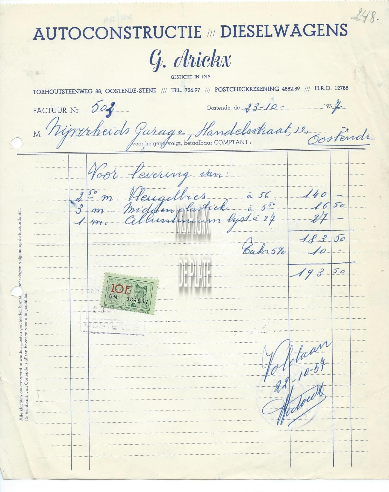 Omschrijving Gesticht in 1919 Trefwoorden HANDEL ; FACTUREN G. ARICKX (GARAGE) VERVOER ; GARAGES TORHOUTSESTEENWEG Plaatskenmerk ARCHIEF 110 ARCHIEFDOOS HANDEL Inventarisnummers 2022/2214 23/ 10/ 1957 Herkomst AANKOOP Print