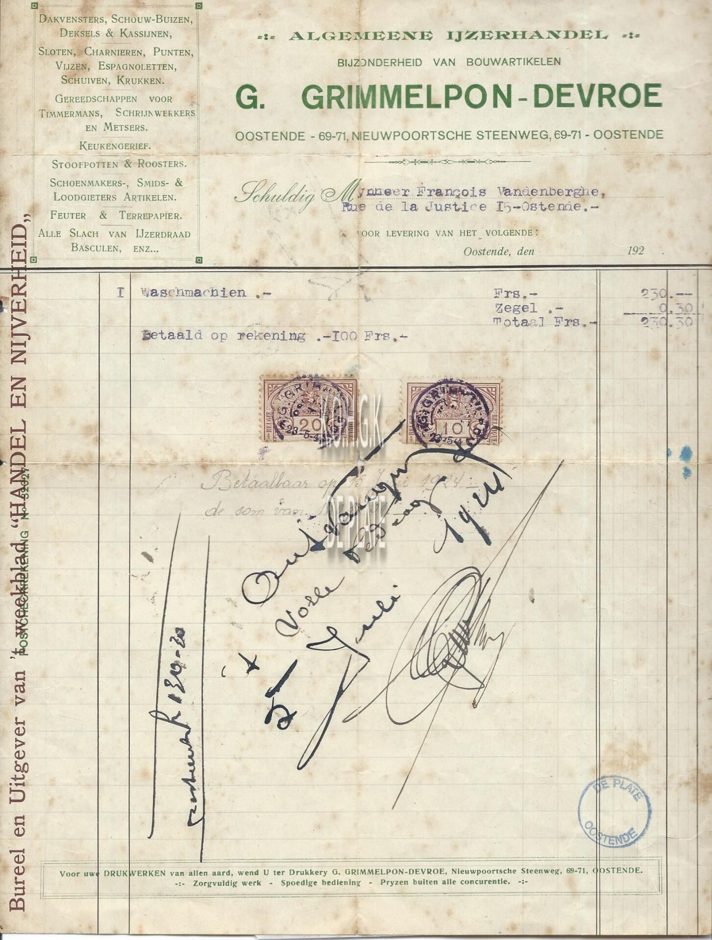 Trefwoorden HANDEL ; FACTUREN G. GRIMMELPON-DEVROE (IJZERHANDEL BOUWMATERIALEN) NIEUWPOORTSESTEENWEG Plaatskenmerk ARCHIEF 110 ARCHIEFDOOS HANDEL Inventarisnummers 2022/2365 05/ 07/ 1924 Print