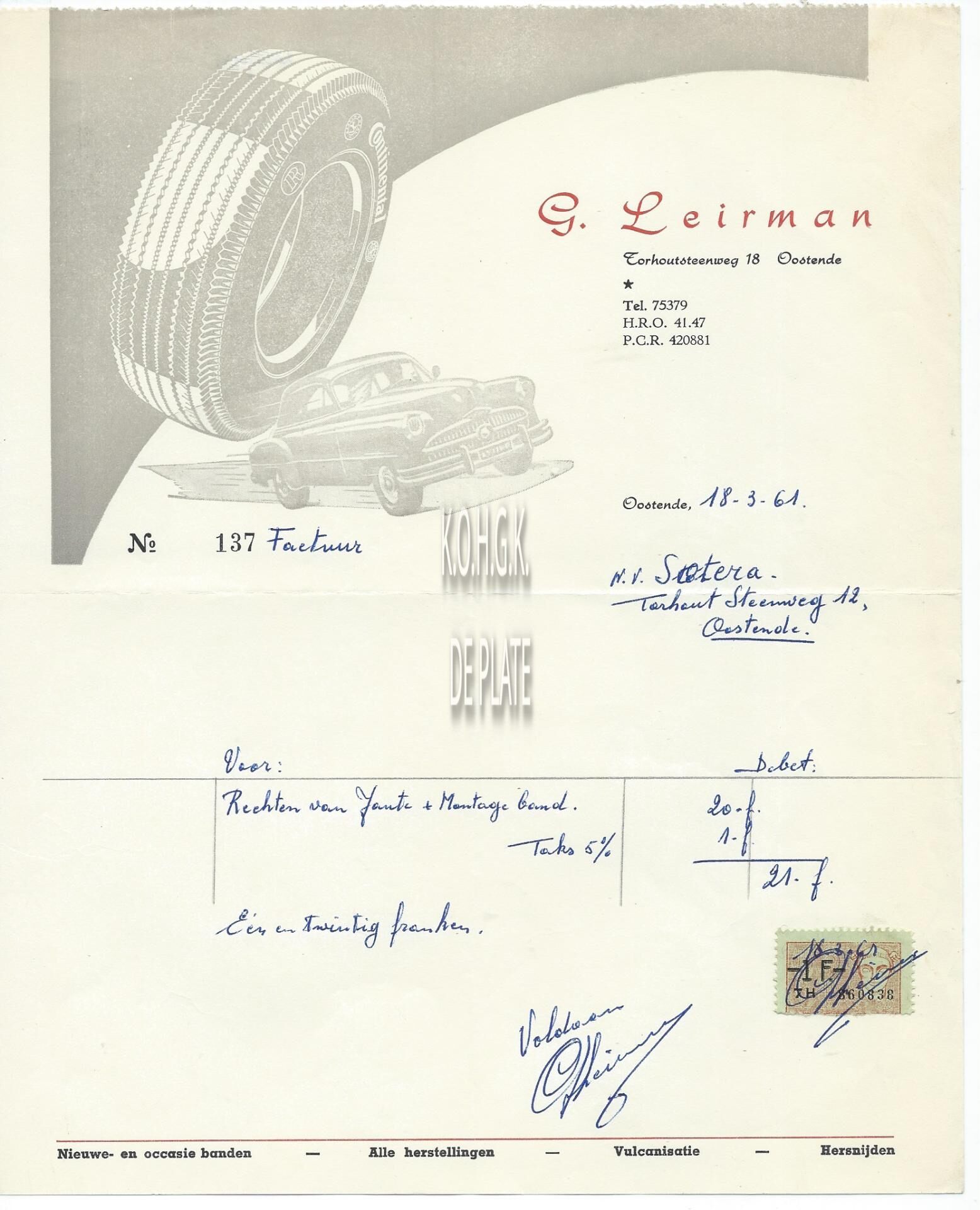 Omschrijving Nieuwe en occasie banden - Alle herstellingen - vulcanisatie - hersnijden Trefwoorden HANDEL ; FACTUREN LEIRMAN G. (AUTOBANDEN) HANDEL ; AUTOBANDEN TORHOUTSESTEENWEG Plaatskenmerk ARCHIEF 110 ARCHIEFDOOS HANDEL Inventarisnummers 2022/0241 18/ 03/ 1961 Herkomst AANKOOP Print