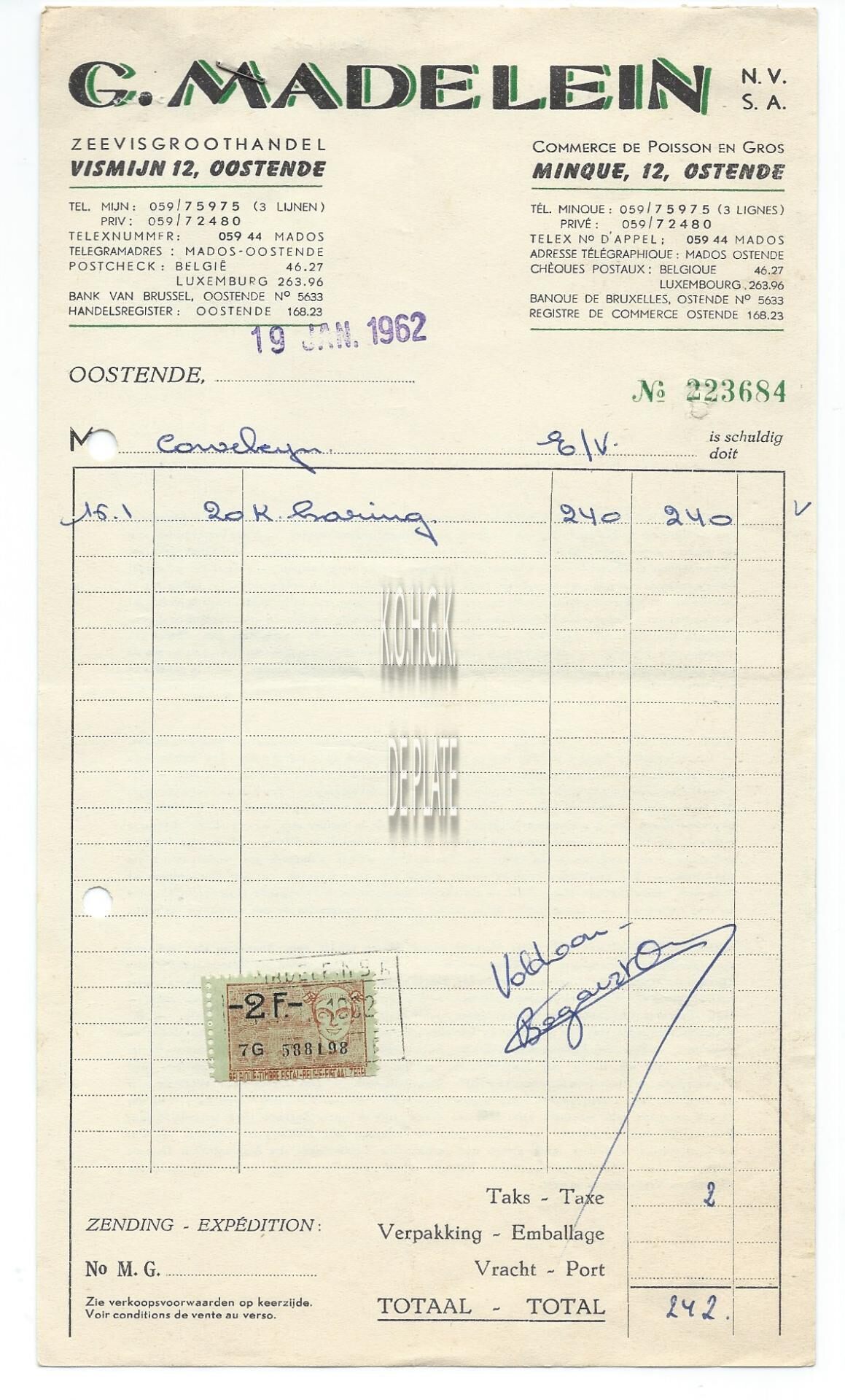 Omschrijving Zeevisgroothandel Trefwoorden HANDEL ; FACTUREN G. MADELEIN (VISHANDEL) HANDEL ; VISHANDEL VISMIJN ; BEDRIJVEN Plaatskenmerk ARCHIEF 110 ARCHIEFDOOS HANDEL Inventarisnummers 2022/0086 19/ 01/ 1962 Herkomst AANKOOP Print