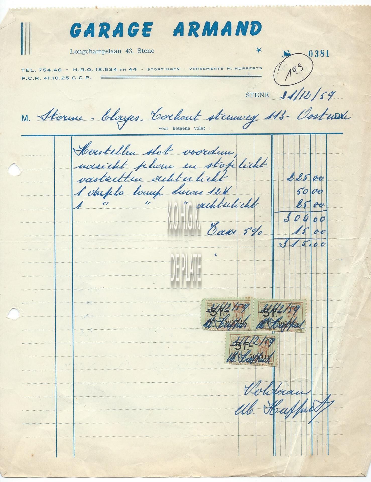 Factuur : Garage Armand. Longchamplaan 43, Stene