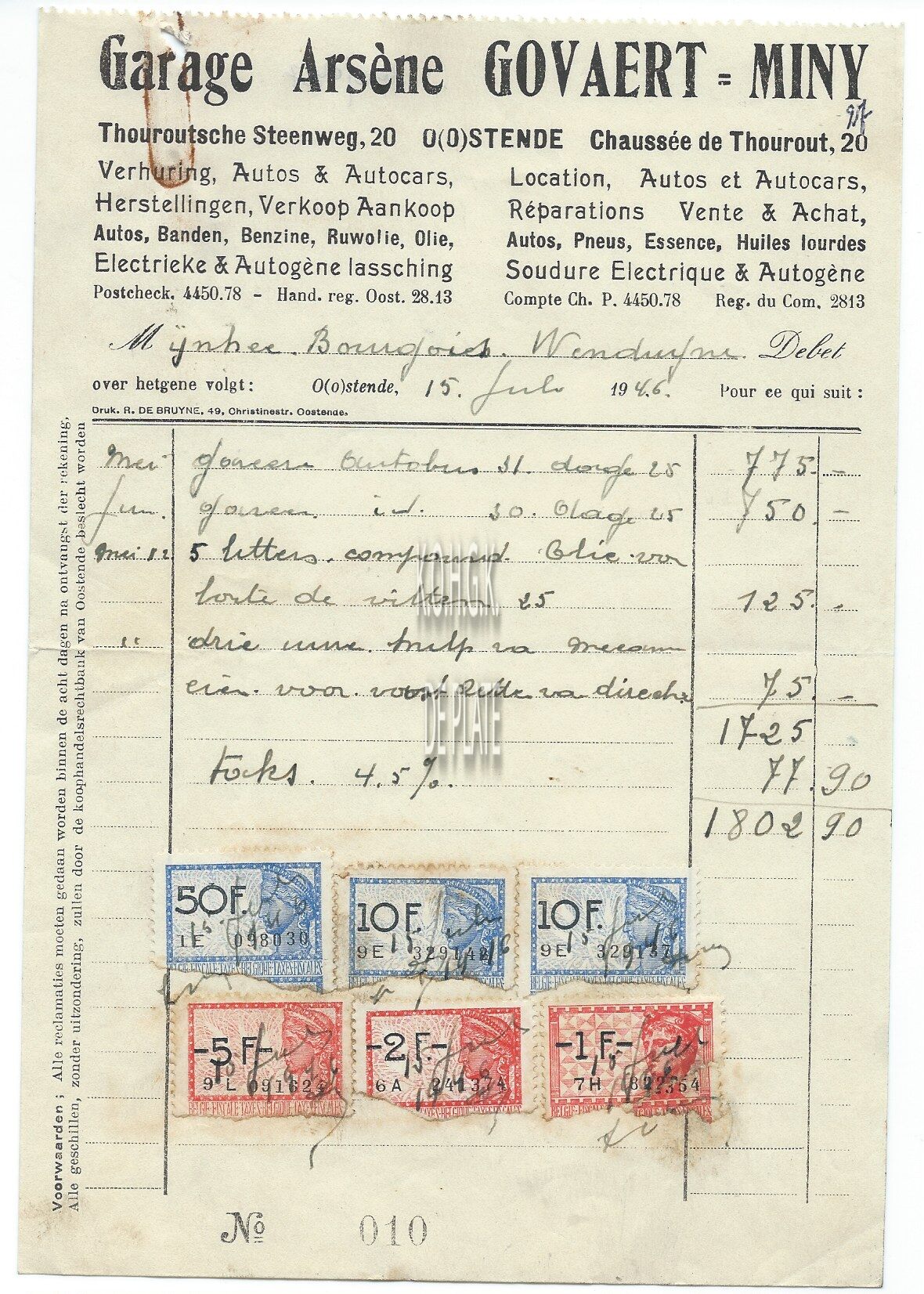 Trefwoorden HANDEL ; FACTUREN ARSÈNE GOVAERT-MINY (GARAGE AUTOCARBEDRIJF) VERVOER ; GARAGES TORHOUTSESTEENWEG Plaatskenmerk ARCHIEF 110 ARCHIEFDOOS HANDEL Inventarisnummers 2022/0467 15/ 07/ 1946 Herkomst AANKOOP Vervaardiger Druk. R. De Bruyne Print