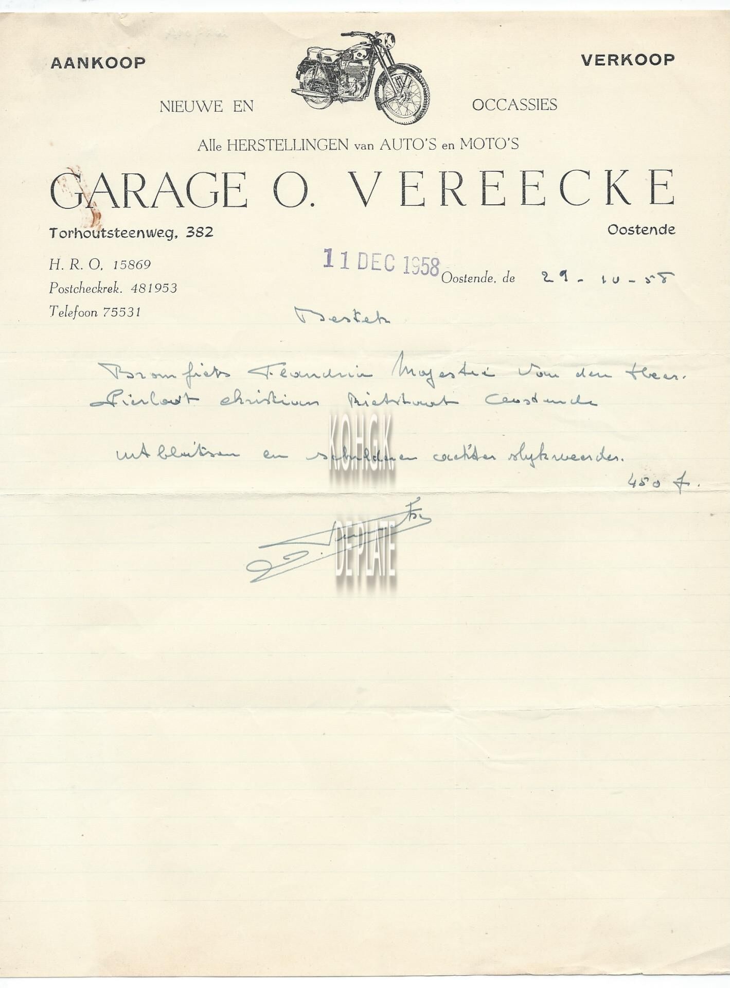 Omschrijving Aankoop en verkoop nieuwe en occasies. Alle herstellingen van auto's en moto's Trefwoorden HANDEL ; FACTUREN GARAGE O. VEREECKE VERVOER ; GARAGES TORHOUTSESTEENWEG Plaatskenmerk ARCHIEF 110 ARCHIEFDOOS HANDEL Inventarisnummers 2022/0164 29/ 10/ 1958 Herkomst AANKOOP Print