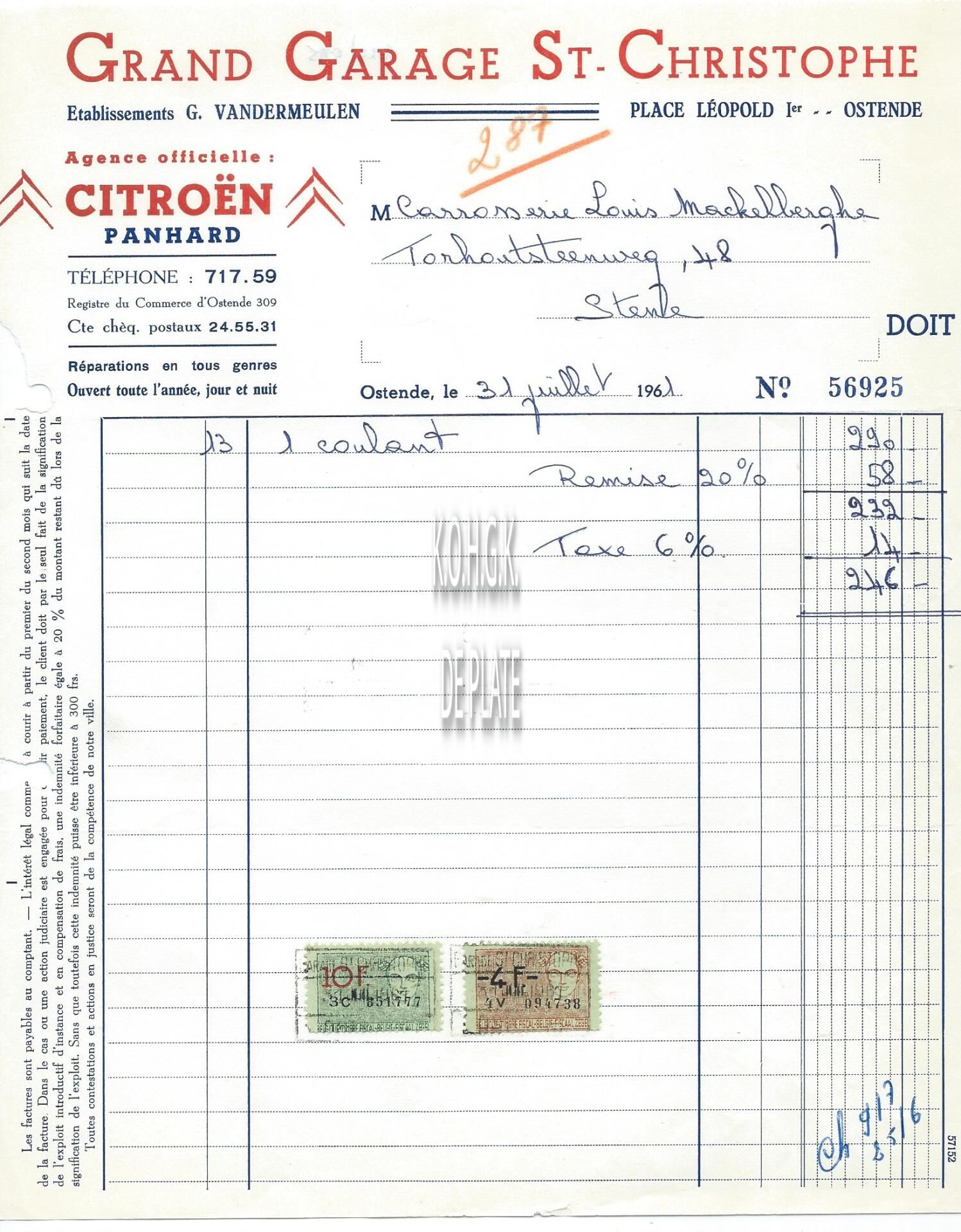 Factuur : Grand Garage St-Chrisophe. Leopold I-plein, Oostende