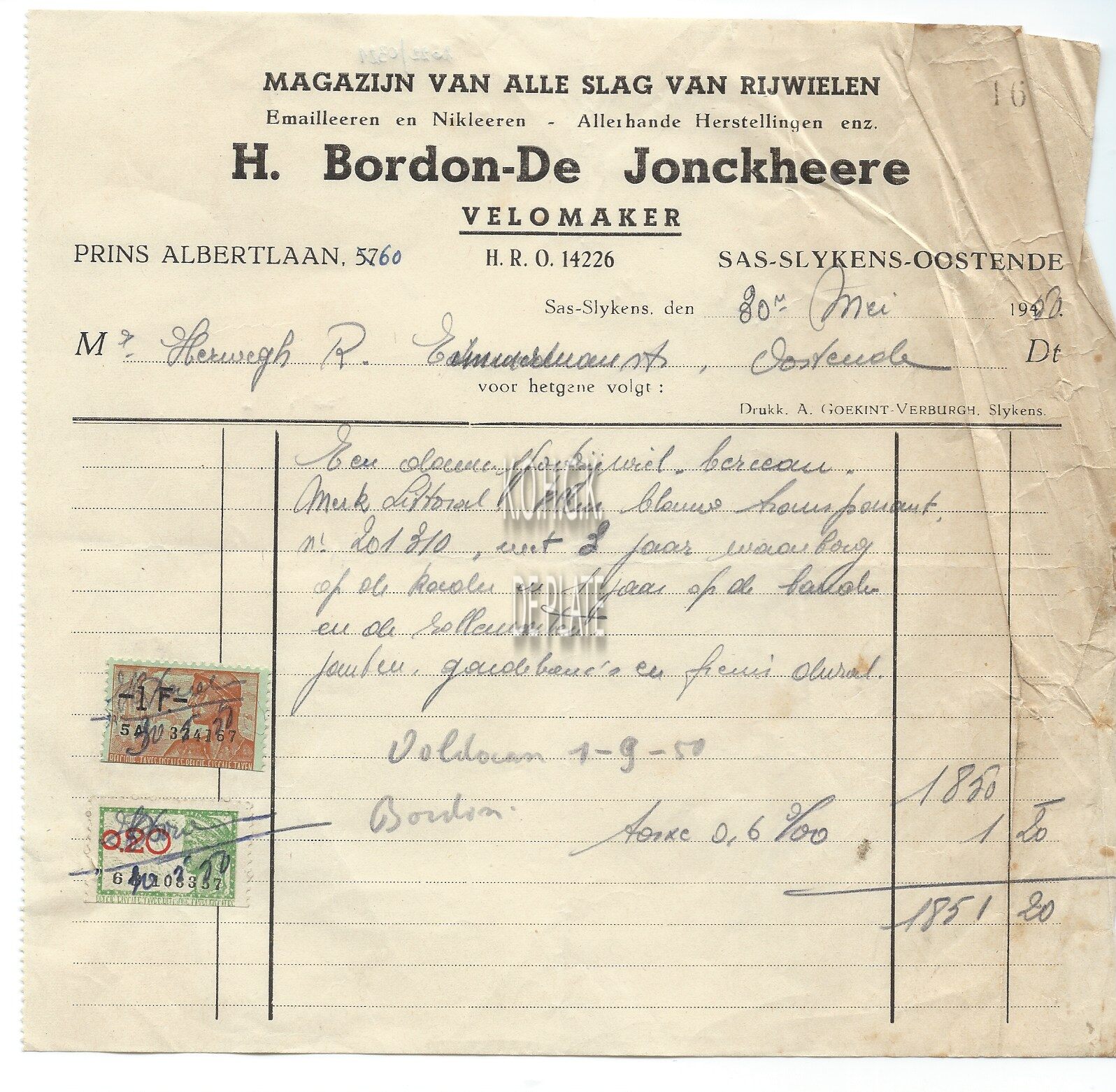Omschrijving Magazijn van alle slag van rijwielen - Velomaker Trefwoorden HANDEL ; FACTUREN H. BORDON-DE JONCKHEERE (FIETSENHANDEL) PRINS ALBERTLAAN VERVOER ; FIETSEN EN BROMFIETSENHANDEL Plaatskenmerk ARCHIEF 110 ARCHIEFDOOS HANDEL Inventarisnummers 2022/0321 30/ 05/ 1950 Herkomst AANKOOP Vervaardiger A. Goekint-Verburgh Print