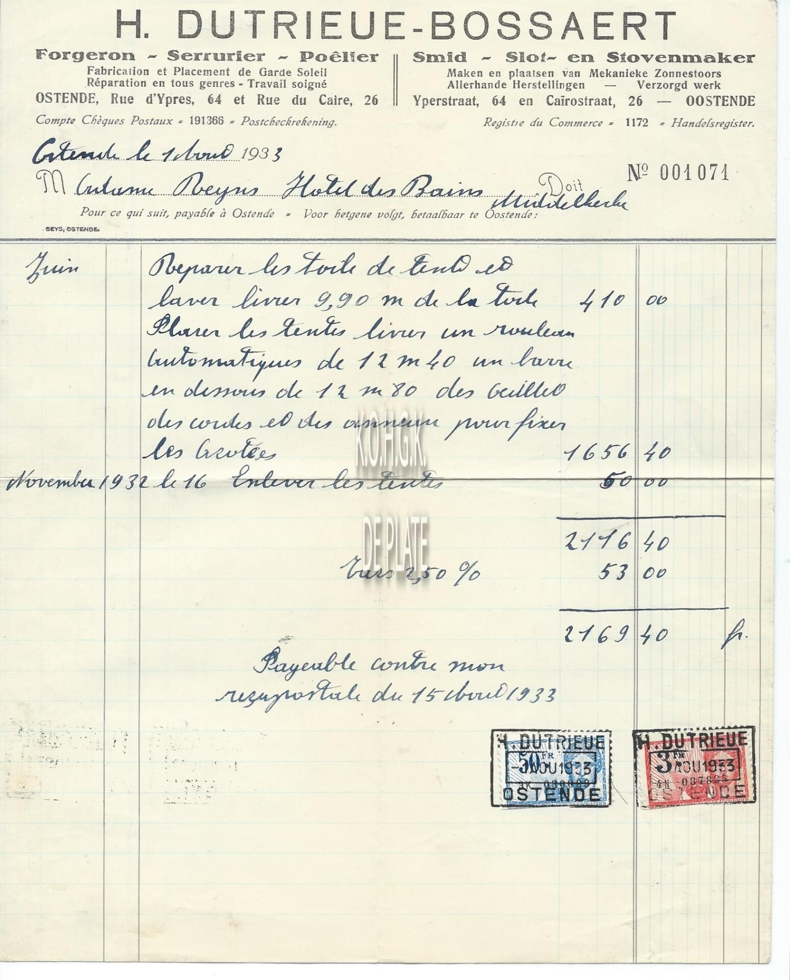 Omschrijving Smid - Slot- en stovenmaker Trefwoorden HANDEL ; FACTUREN HENRI DUTRIEUE-BOSSAERT (SMEDERIJ) NIJVERHEID ; METAALBEDRIJVEN IEPERSTRAAT KAIROSTRAAT Plaatskenmerk ARCHIEF 110 ARCHIEFDOOS HANDEL Inventarisnummers 2022/0290 01/ 08/ 1933 Herkomst AANKOOP Print