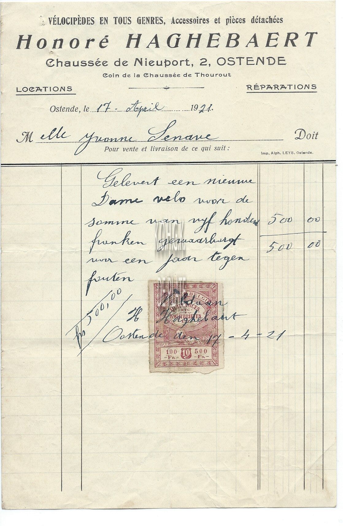 Omschrijving Vélocipèdes en tous genres Trefwoorden HANDEL ; FACTUREN HAGHEBAERT HONORÉ (RIJWIELEN) NIEUWPOORTSESTEENWEG Plaatskenmerk ARCHIEF 110 ARCHIEFDOOS HANDEL Inventarisnummers 2014/4458 17/ 04/ 1921 Herkomst HOSTYN NORBERT Vervaardiger Imprimerie Alph. Leys Print