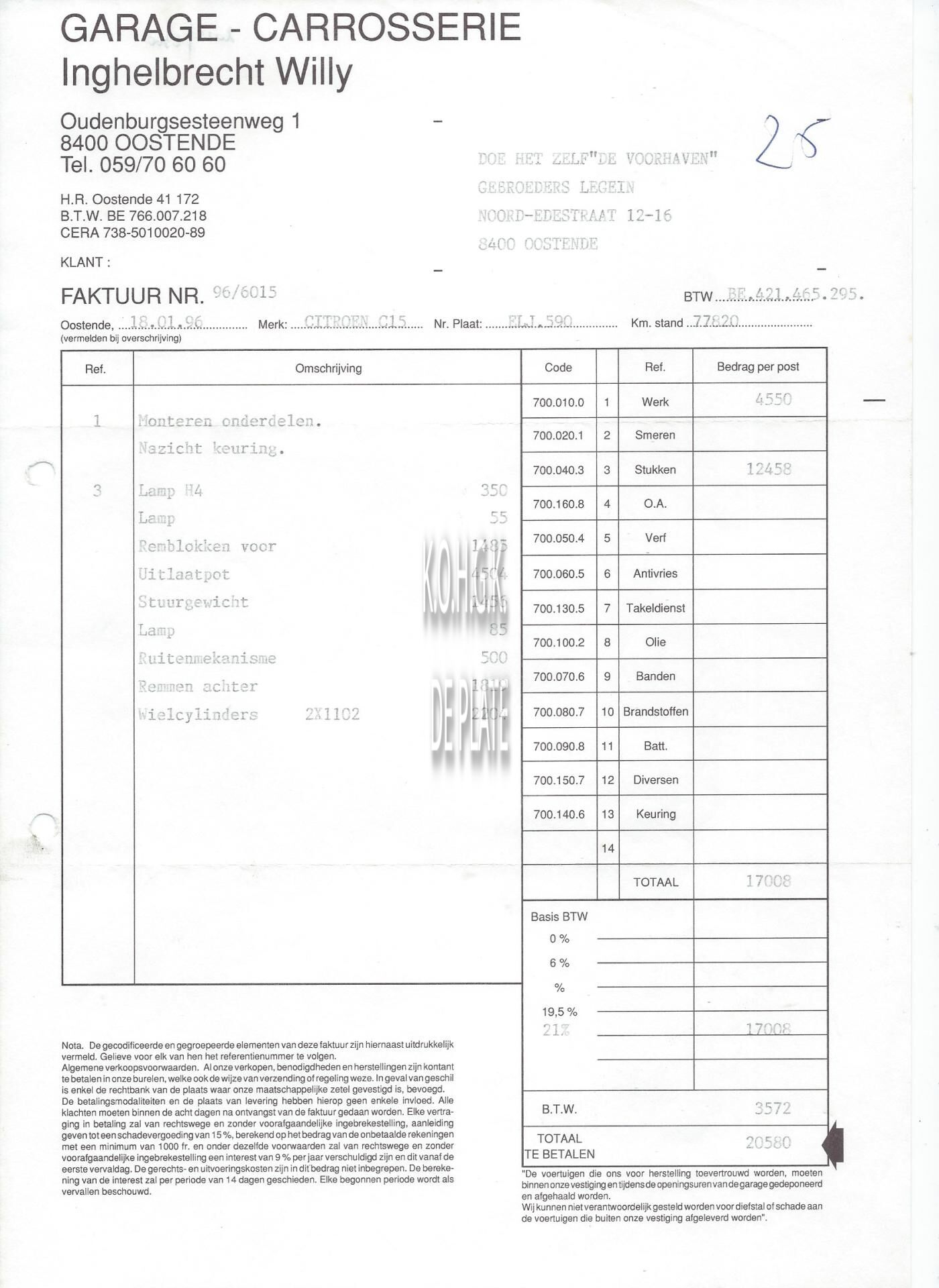Trefwoorden HANDEL ; FACTUREN INGHELBRECHT WILLY (GARAGE CARROSSERIE) VERVOER ; GARAGES OUDENBURGSESTEENWEG Plaatskenmerk ARCHIEF 110 ARCHIEFDOOS HANDEL Inventarisnummers 2022/2300 18/ 01/ 1996 Herkomst COULIER L. Print