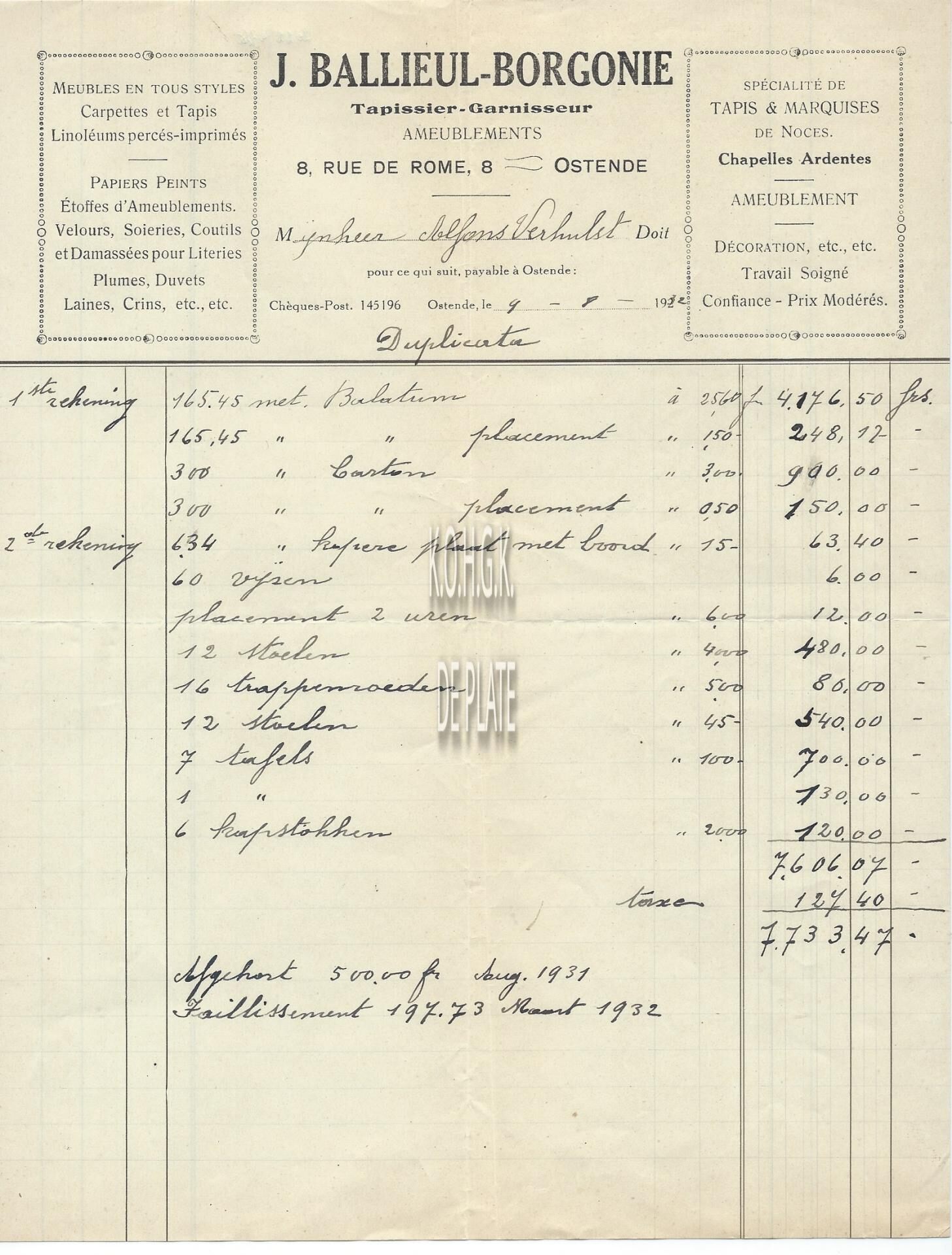 Factuur : J. Ballieul-Borgonie. Tapissier-Garnisseur - Ameublements. Romestraat 8, Oostende