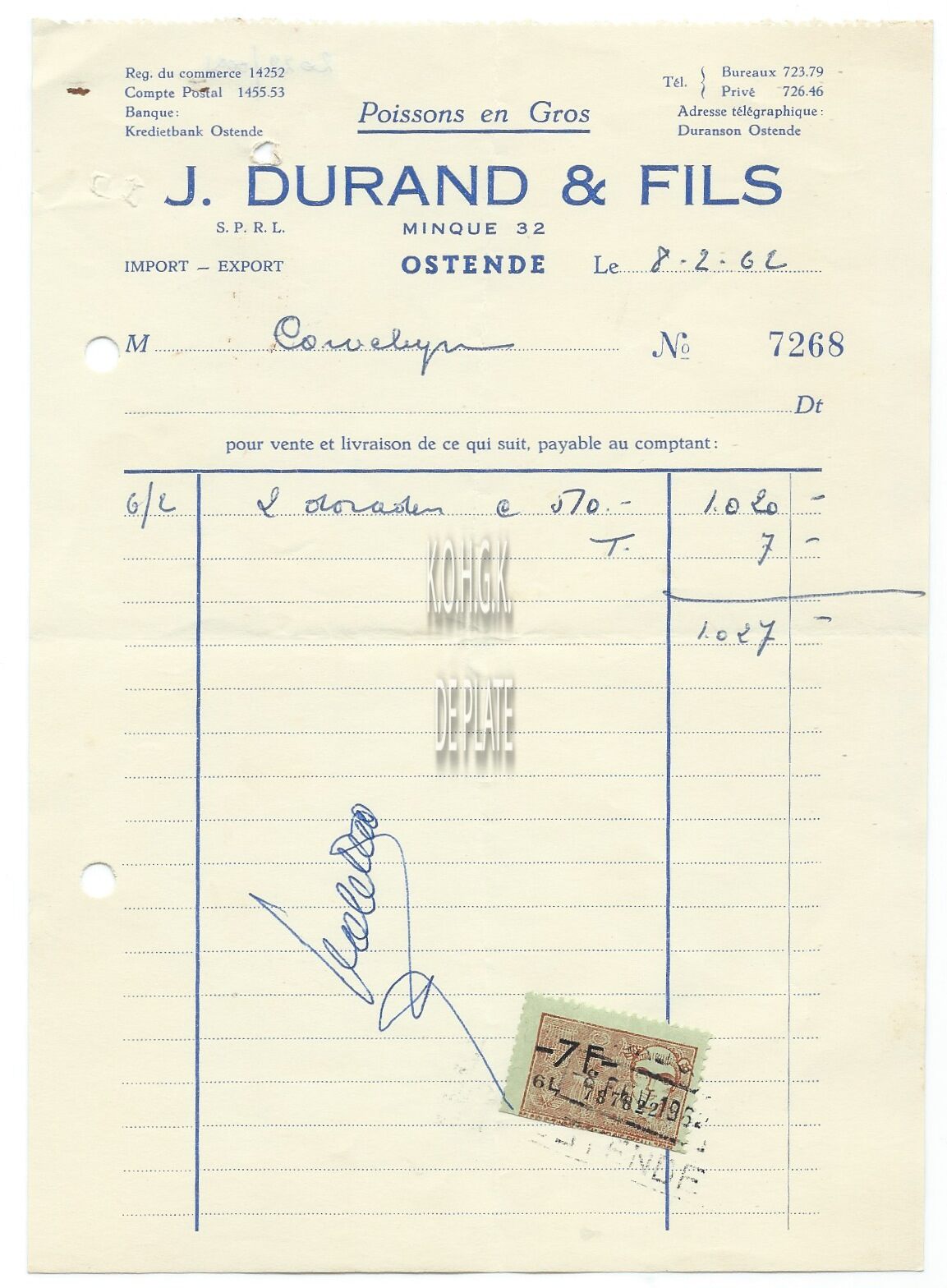 Omschrijving Import - Export Trefwoorden HANDEL ; FACTUREN J. DURAND ET FILS (VISHANDEL) HANDEL ; VISHANDEL VISMIJN ; BEDRIJVEN Plaatskenmerk ARCHIEF 110 ARCHIEFDOOS HANDEL Inventarisnummers 2022/0091 08/ 02/ 1962 Herkomst AANKOOP Print