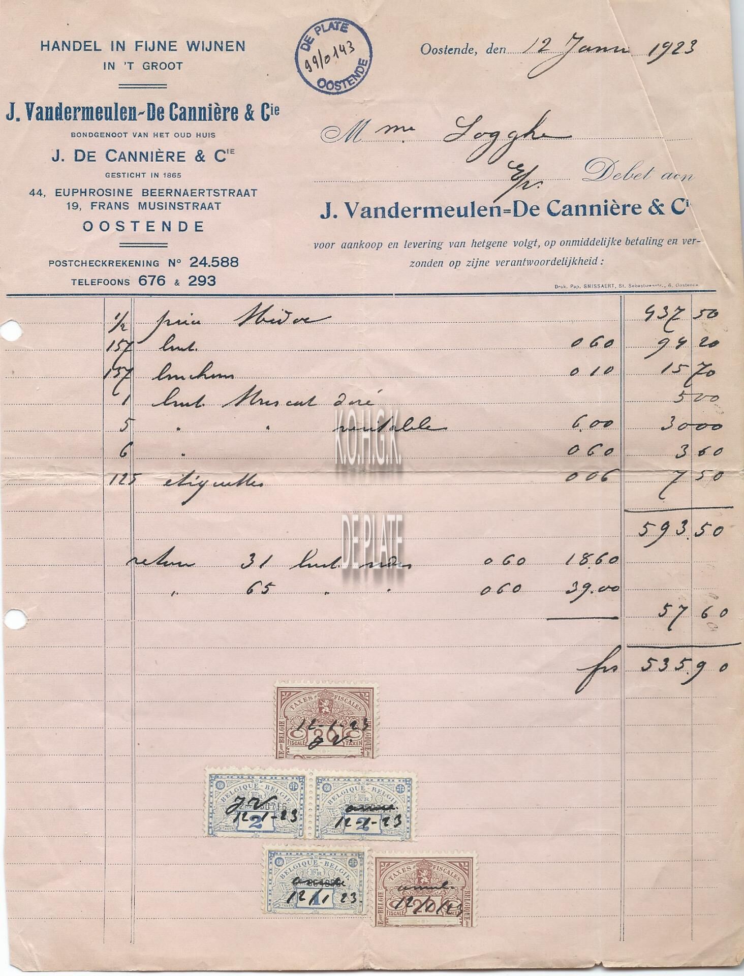 Factuur : J. Vandermeulen-De Cannière & Cie. Handel in fijne wijnen. Euphrosina Beernaertstraat 44 en Frans Musinstraat 44, Oostende