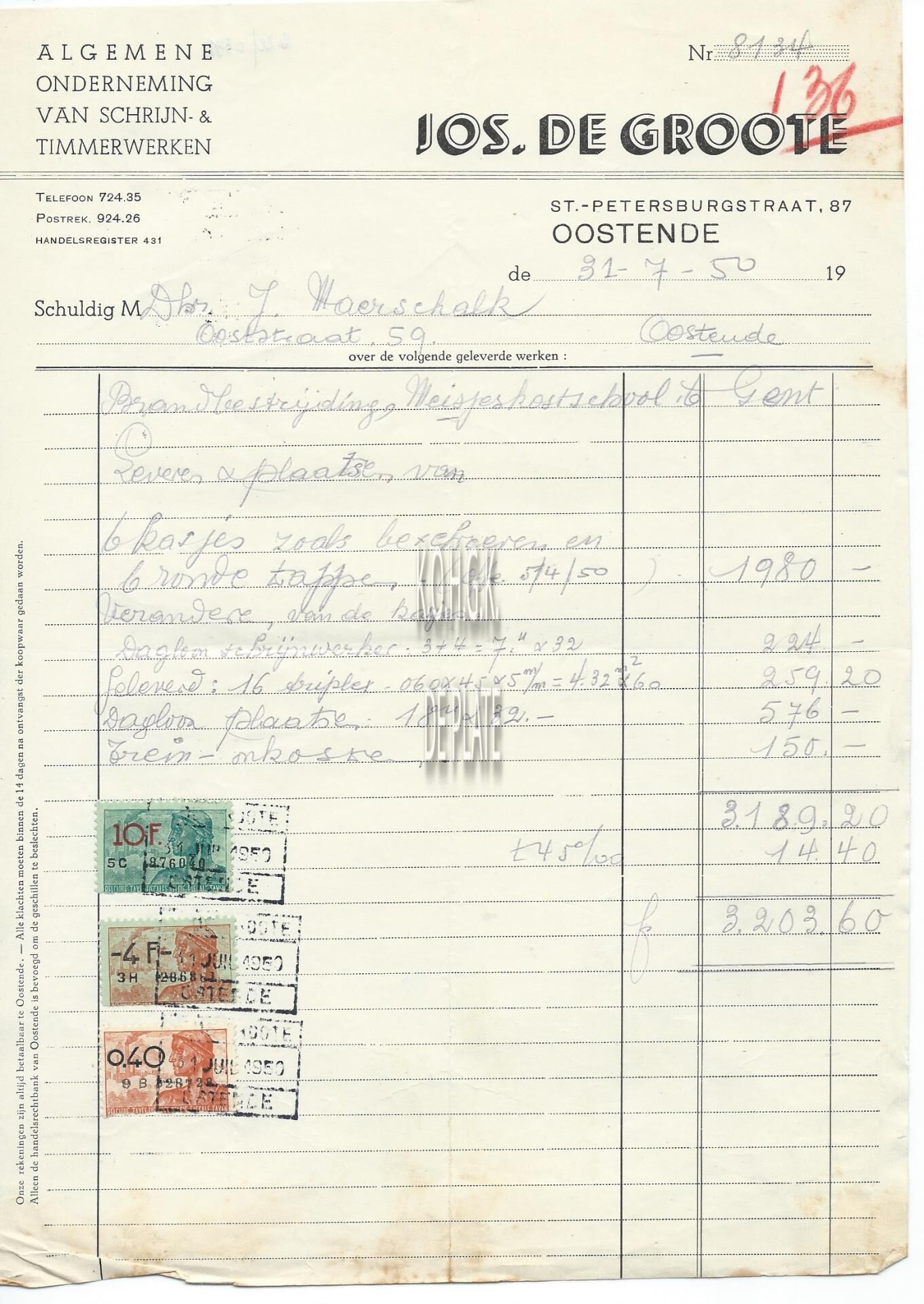 Trefwoorden HANDEL ; FACTUREN JOS. DE GROOTE (SCHRIJNWERKERIJ) SINT-PETERBURGSTRAAT Plaatskenmerk ARCHIEF 110 ARCHIEFDOOS HANDEL Inventarisnummers 2022/0338 31/ 07/ 1950 Herkomst AANKOOP Print