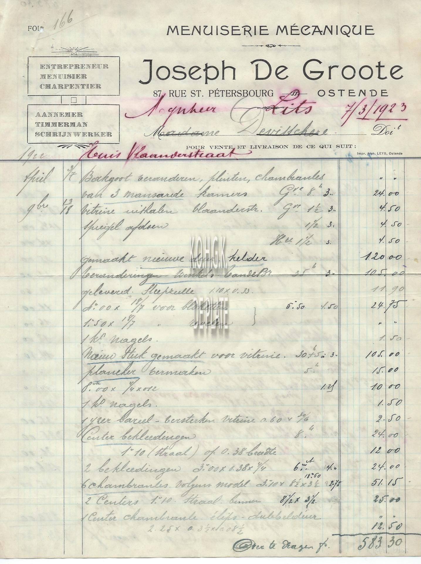 Mechanische schrijnwerkerij gesticht in 1887 door Joseph De Groote en overgenomen door zijn zoon Joseph jr. in 1937. Deze wordt sedert 1960 bijgestaan door zijn zoon Willy. De firma neemt alle schrijnwerk aan. Specialiteit : het inrichten van keukens en winkels. De firma telt een twintigtal werknemers. In : Dit is West-Vlaanderen : steden, gemeenten, bevolking : dl.2 / Lucien Dendooven. Flandria, 1963. p. 1277
