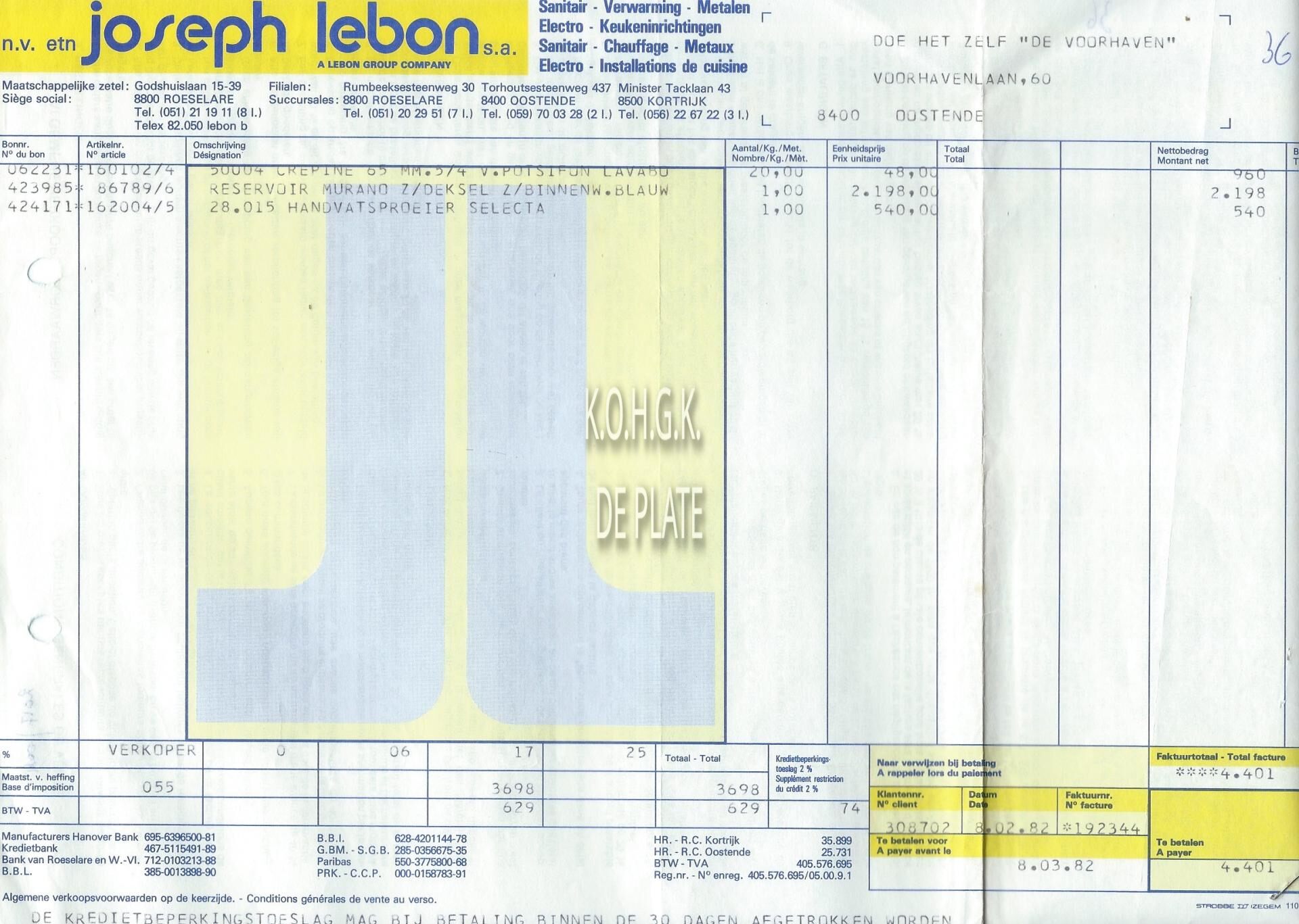 Omschrijving Electro - Keukeninrichtingen Trefwoorden HANDEL ; FACTUREN JOSEPH LEBON (SANITAIR VERWARMING METALEN KEUKENINRICHTINGEN) TORHOUTSESTEENWEG SANITAIR Plaatskenmerk ARCHIEF 110 ARCHIEFDOOS HANDEL Inventarisnummers 2017/0061 08/ 02/ 1982 Print