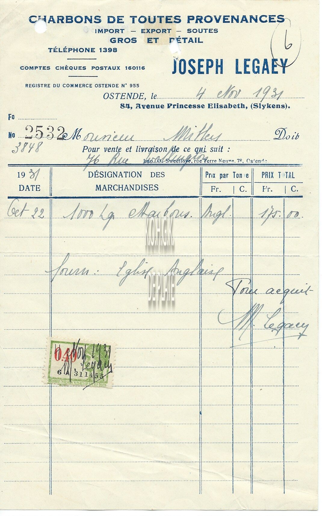 Factuur : Joseph Legaey. Kolenhandel. Prinses Elisabethlaan 84, Bredene