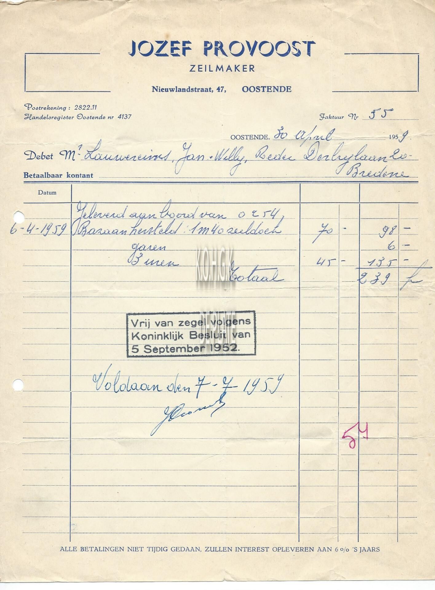 Trefwoorden HANDEL ; FACTUREN PROVOOST JOZEF (ZEILMAKER) SCHEEPSUITRUSTINGEN NIEUWLANDSTRAAT Plaatskenmerk ARCHIEF 110 ARCHIEFDOOS HANDEL Inventarisnummers 2022/0498 30/ 04/ 1959 Herkomst AANKOOP Print