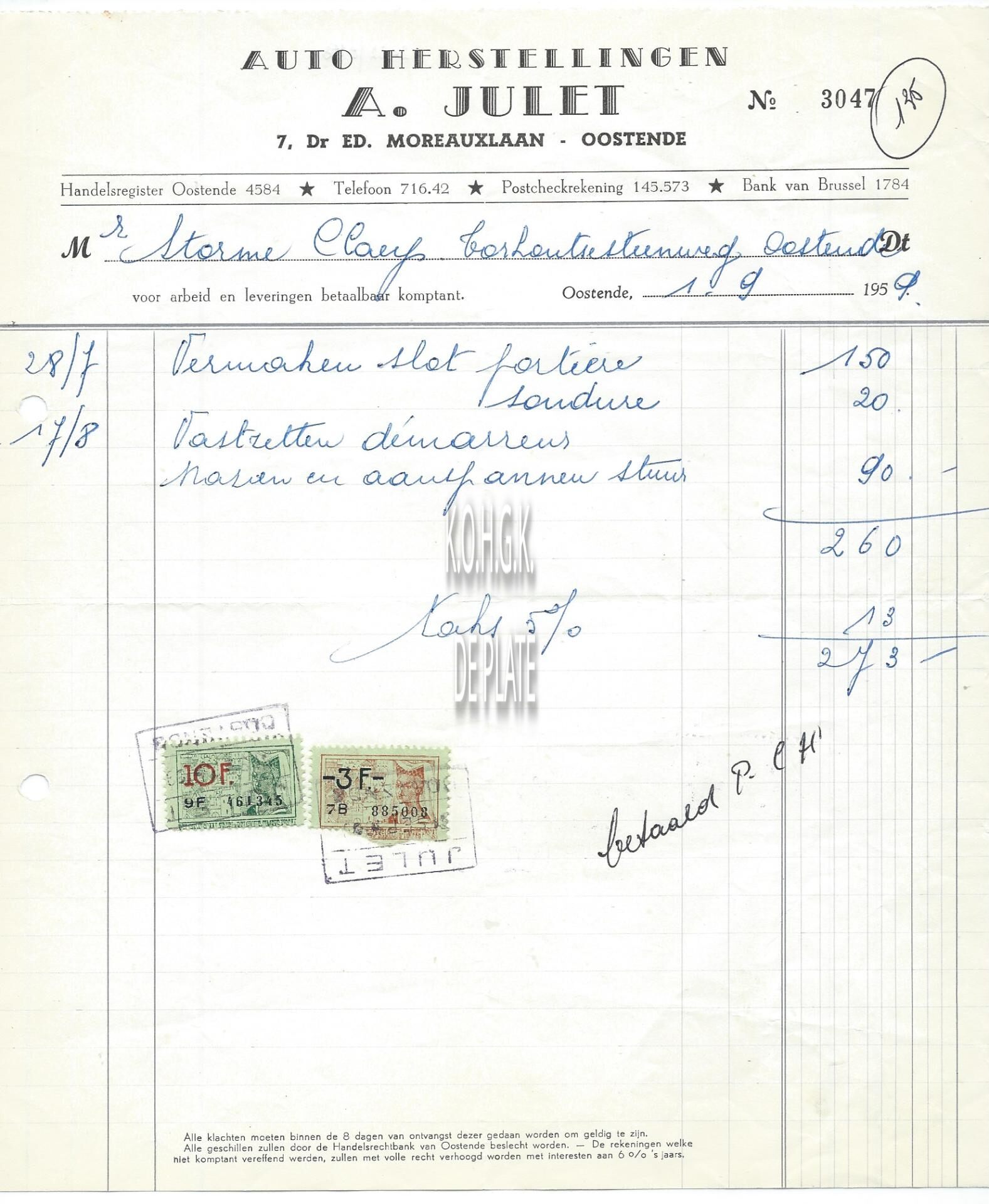 Trefwoorden HANDEL ; FACTUREN A. JULET (GARAGE) VERVOER ; GARAGES DOKTER EDUARD MOREAUXLAAN Plaatskenmerk ARCHIEF 110 ARCHIEFDOOS HANDEL Inventarisnummers 2022/0183 01/ 09/ 1959 Herkomst AANKOOP Print