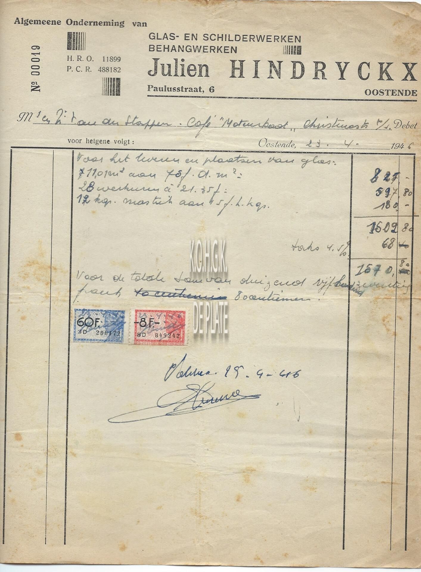 Trefwoorden HANDEL ; FACTUREN JULIEN HINDRYCKX (GLAS- SCHILDER- EN DECORATIEWERKEN) SINT-PAULUSSTRAAT Plaatskenmerk ARCHIEF 110 ARCHIEFDOOS HANDEL Inventarisnummers 2022/0337 23/ 04/ 1946 Herkomst AANKOOP Print