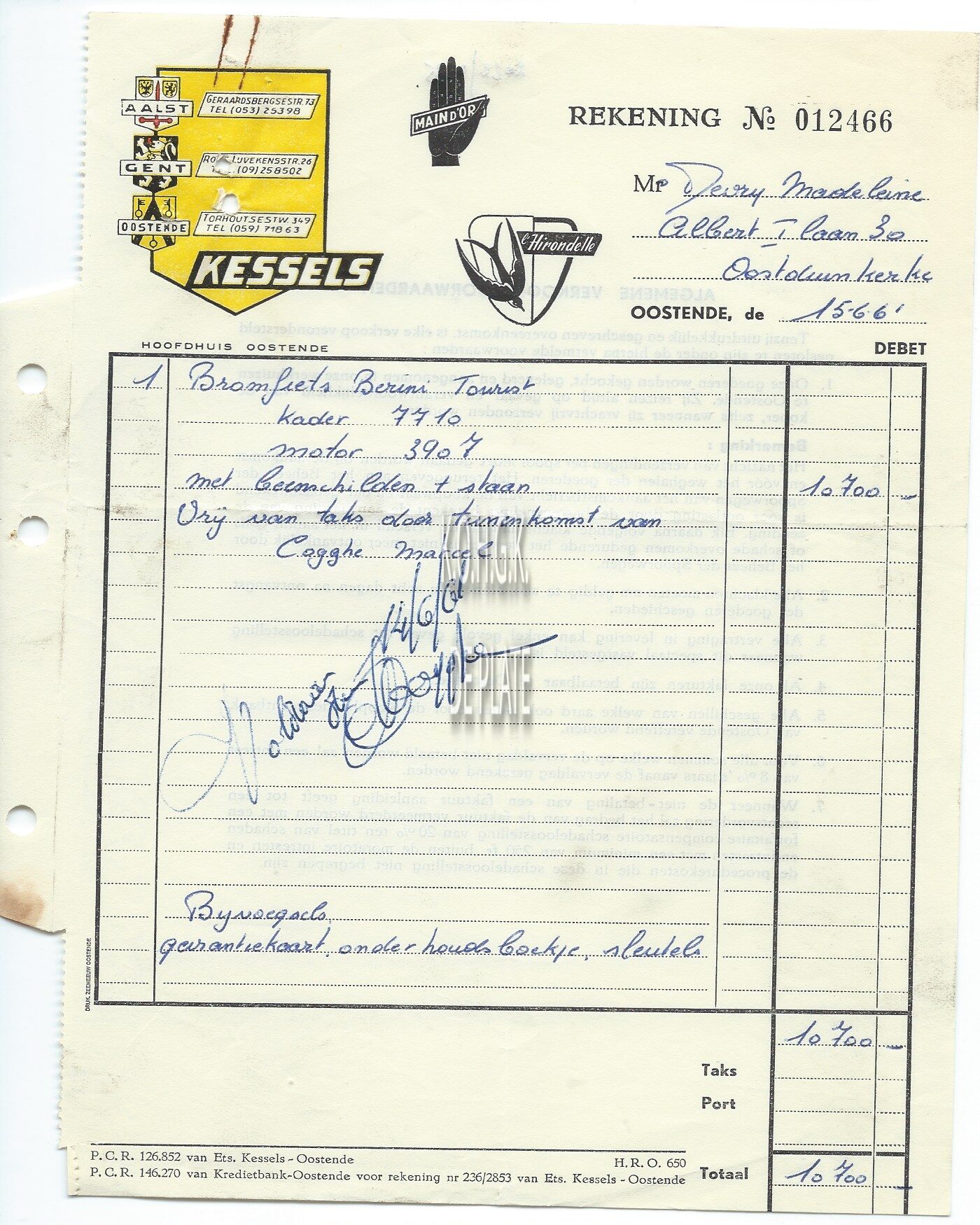 Omschrijving Main d'Or - l'Hirondelle Trefwoorden HANDEL ; FACTUREN KESSELS (FIETSEN BROMFIETSEN) TORHOUTSESTEENWEG Plaatskenmerk ARCHIEF 110 ARCHIEFDOOS HANDEL Inventarisnummers 2022/0235 15/ 06/ 1961 Herkomst AANKOOP Print
