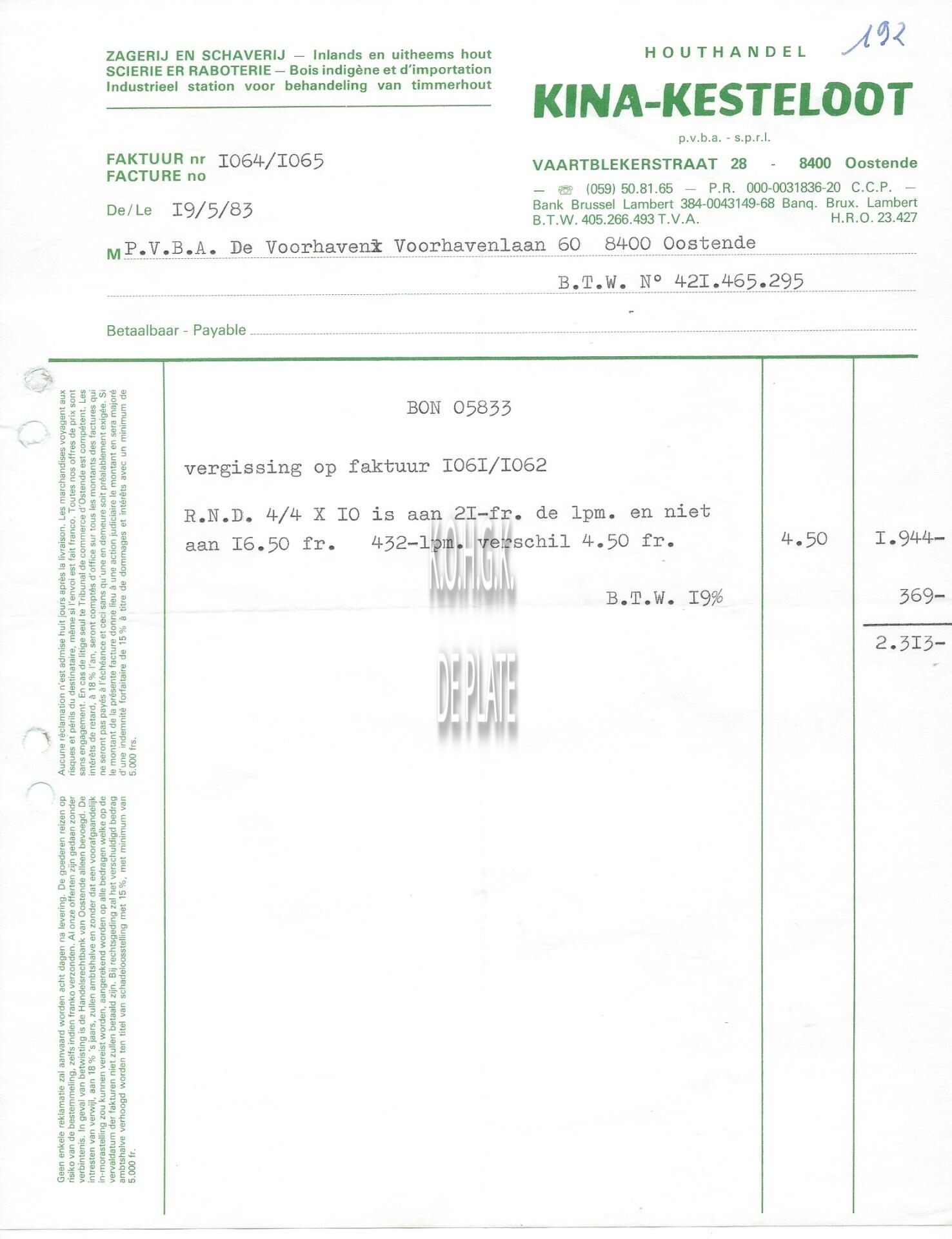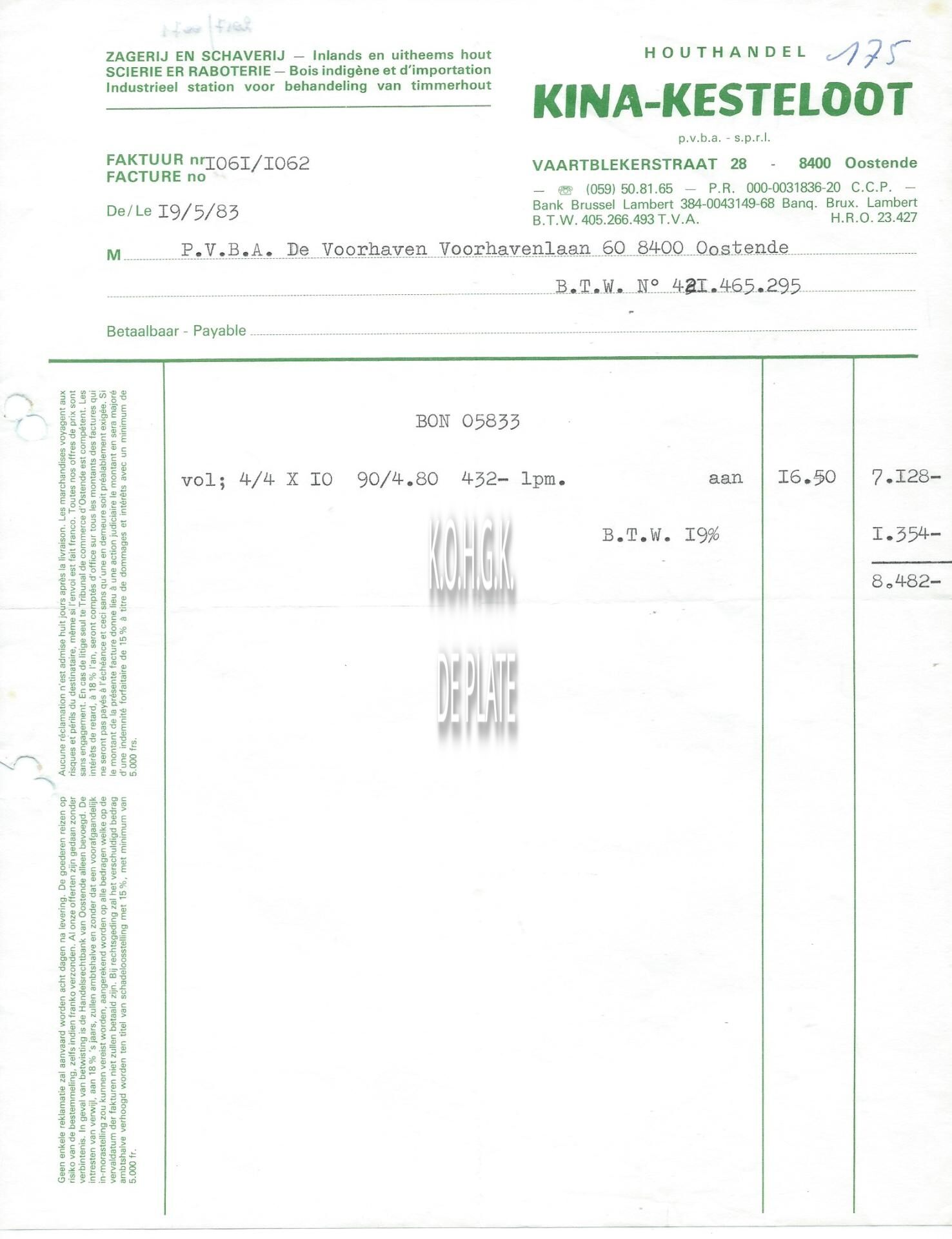 Trefwoorden HANDEL ; FACTUREN KINA-KESTELOOT (HOUTHANDEL ZAGERIJ EN SCHAVERIJ) HANDEL ; HOUTHANDEL VAARTBLEKERSSTRAAT Plaatskenmerk ARCHIEF 110 ARCHIEFDOOS HANDEL Inventarisnummers 2017/0071 19/ 05/ 1983 Print