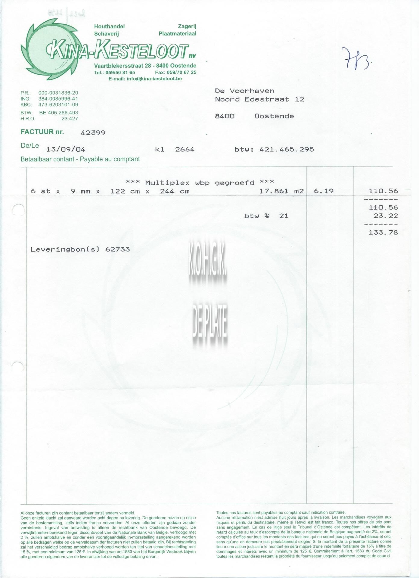 Factuur : Kina-Kesteloot. Houthandel - Zagerij - Schaverij - Plaatmateriaal. Vaartblekersstraat 28, Oostende