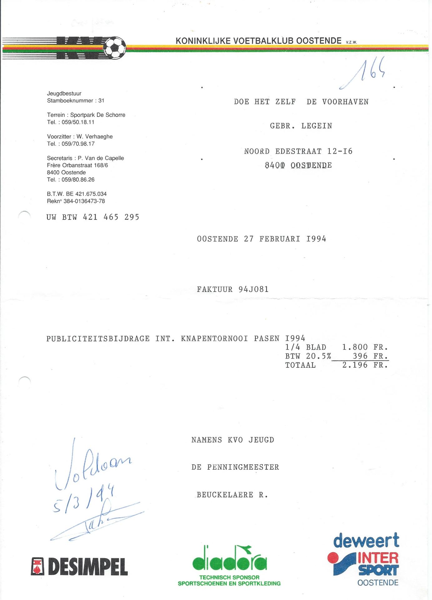 Omschrijving Voorzitter : W. Verhaeghe Trefwoorden HANDEL ; FACTUREN KV OOSTENDE (VOETBAL) SPORT ; VOETBAL VERHAEGHE WILLY (TANDARTS VOORZITTER KV OOSTENDE JEUGD) Plaatskenmerk ARCHIEF 110 ARCHIEFDOOS HANDEL Inventarisnummers 2022/2309 27/ 02/ 1994 Herkomst COULIER L. Print