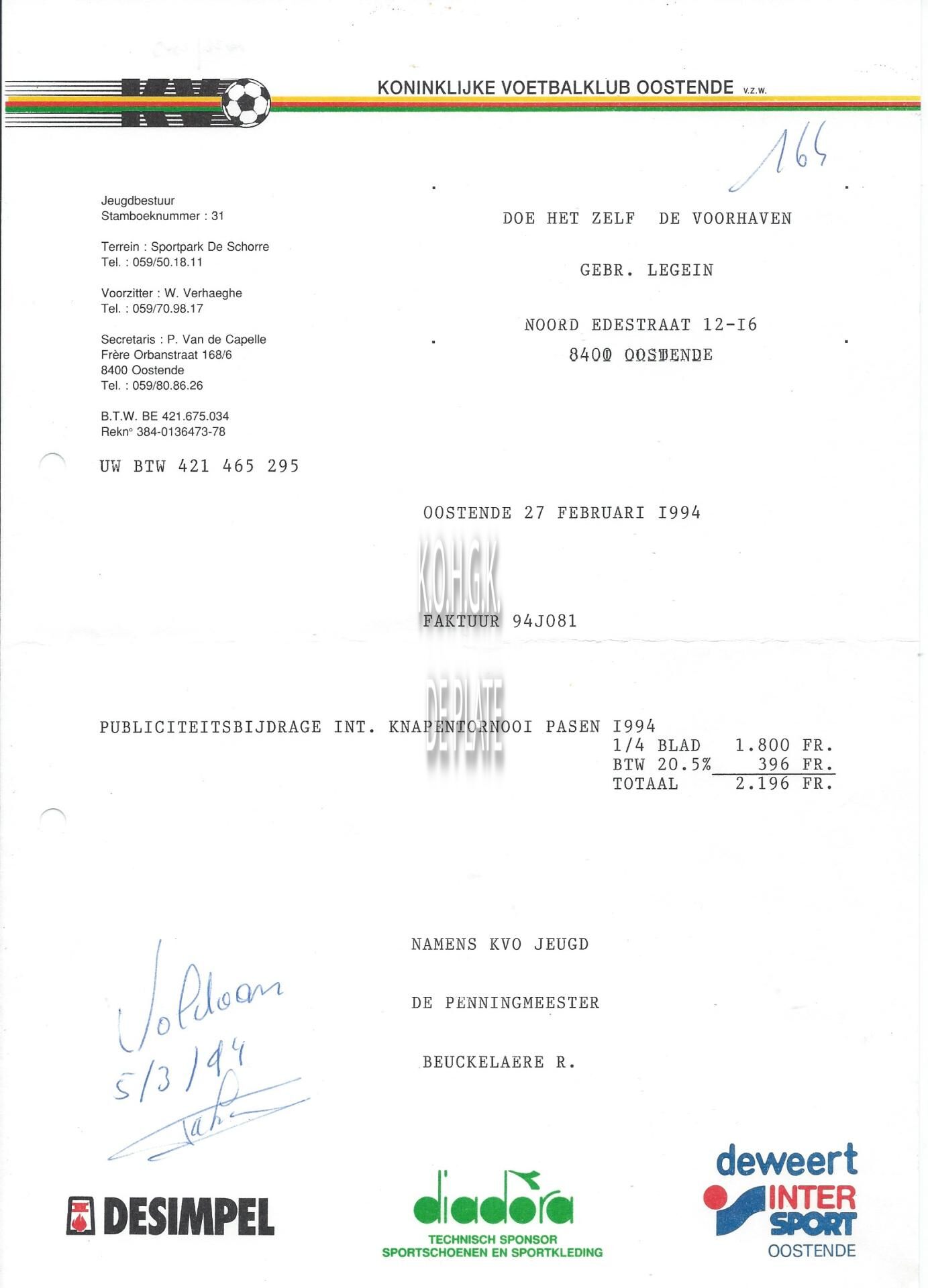 Omschrijving Voorzitter : W. Verhaeghe Trefwoorden HANDEL ; FACTUREN KV OOSTENDE (VOETBAL) SPORT ; VOETBAL VERHAEGHE WILLY (TANDARTS VOORZITTER KV OOSTENDE JEUGD) Plaatskenmerk ARCHIEF 110 ARCHIEFDOOS HANDEL Inventarisnummers 2022/2309 27/ 02/ 1994 Herkomst COULIER L. Print